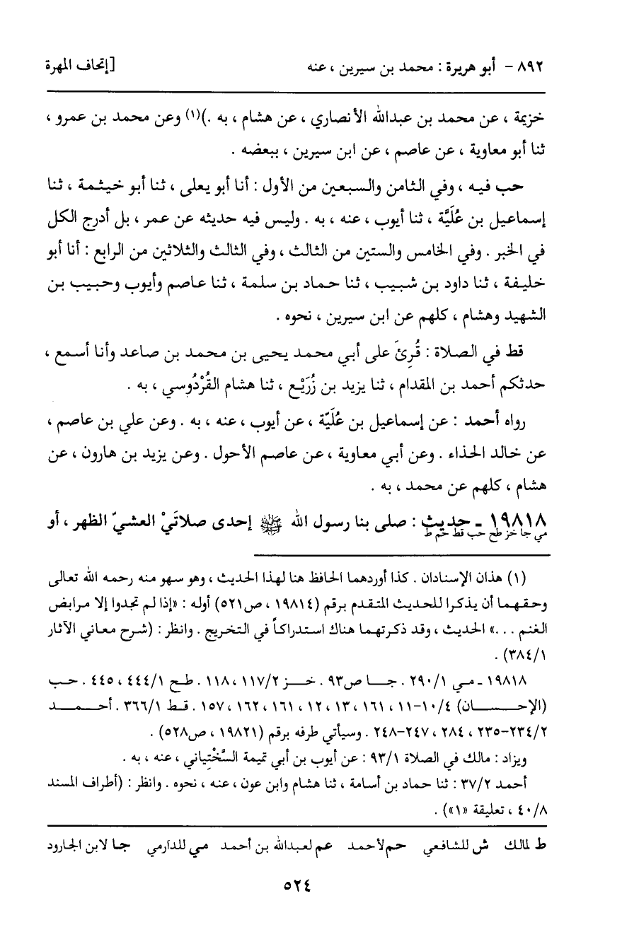 خز فيه: عن محمد بن بشار، عن عبد الوهاب الثقفي، عن أيوب. وعن المخزومي، عن سفيان، به. وعن محمد بن عبد الأعلى، عن بشر بن المفضل. وعن بندار، عن معاذ بن معاذ والحسين بن الحسن بن العريان الحارثي وابن أبي عدي - فرقهم - أربعتهم عن ابن عون، به. وعن يعقوب بن إبراهيم، عن بشر بن المفضل، عن سلمة بن علقمة، عنه، به. وفيه قول ابن سيرين: نبئت أن عمران بن حصين قال: ثم سلم. وعن عيسى بن إبراهيم الغافقي، عن ابن وهب، عن عمرو بن الحارث، عن قتادة، عن ابن سيرين ببعضه: سجد سجدتي السهو يومَ جاءه ذو اليدين بعد السلام.