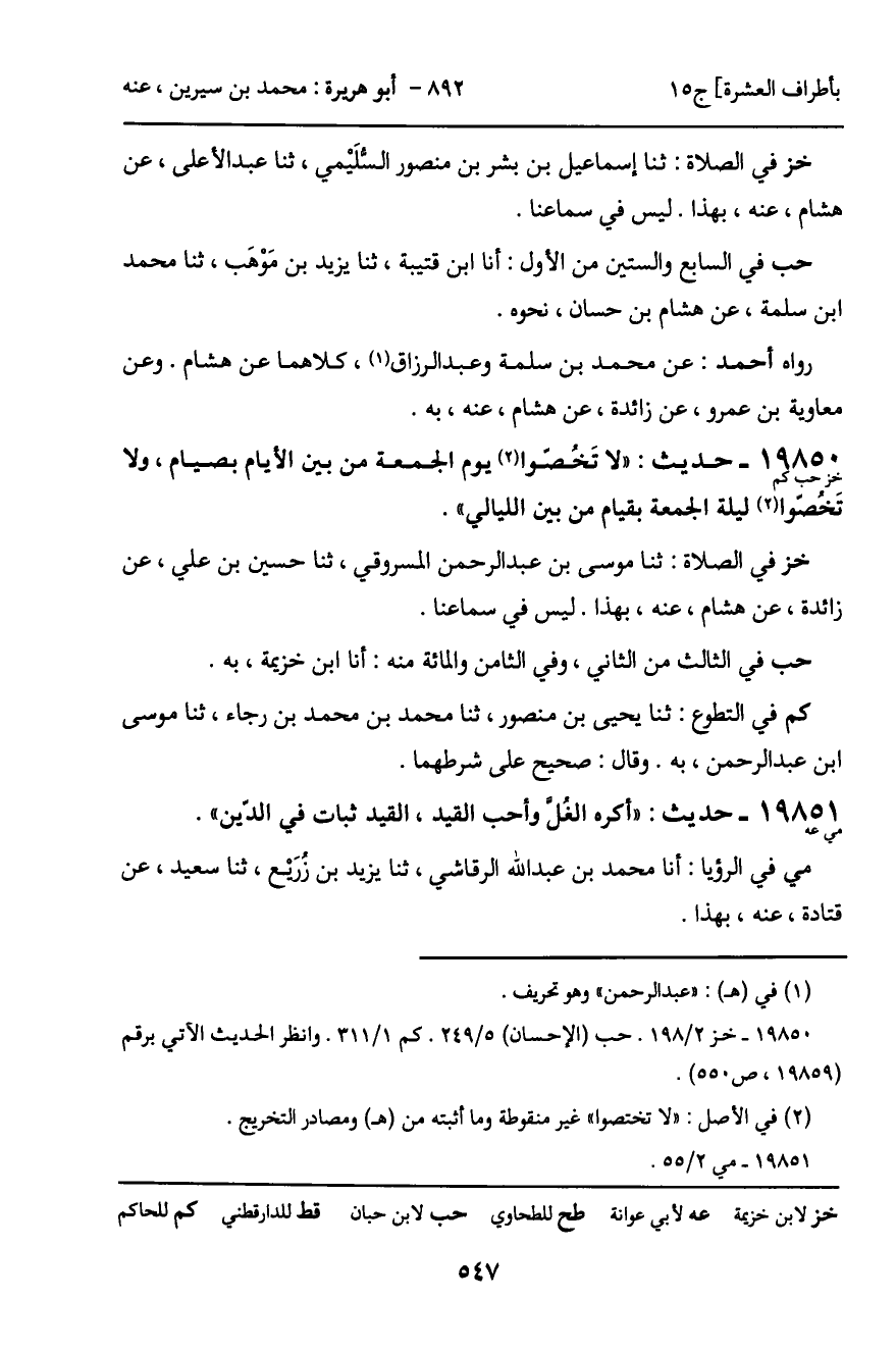 19850 - حديث (خز حب كم) : "لا تَخصّوا يوم الجمعة من بين الأيام بصيام، ولا تَخُصوا ليلة الجمعة بقيام من بين الليالي".