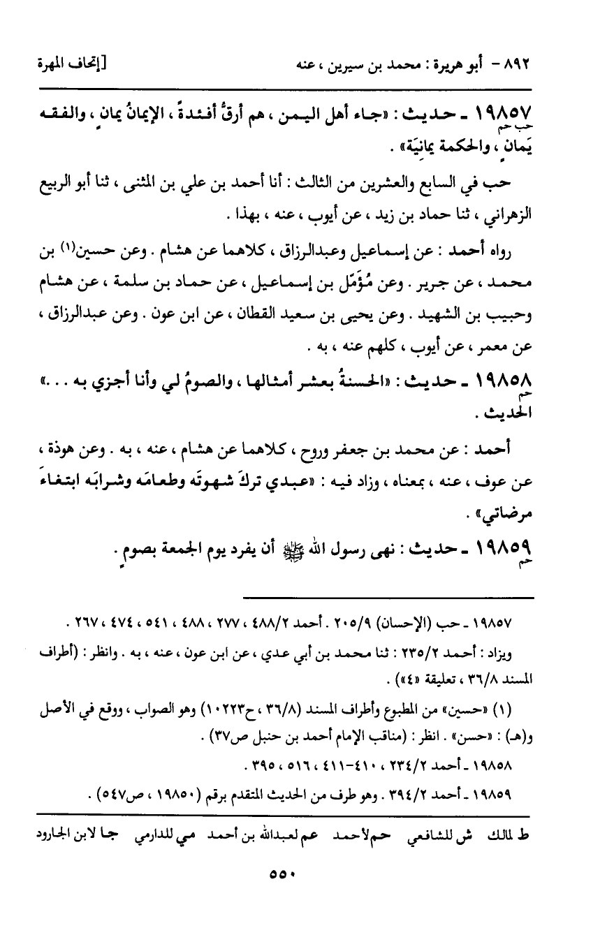 19858 - حديث (حم) : "الحسنة بعشر أمثالها، والصومُ لي وأنا أجزي به ... " الحديث.