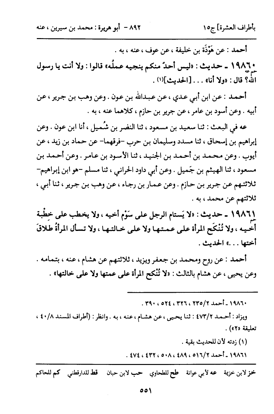 عه في البعث: ثنا سعيد بن مسعود، ثنا النضر بن شُميل، أنا ابن عون. وعن إبراهيم بن إسحاق، ثنا مسدد وسليمان بن حرب - فرقهما - عن حماد بن زيد، عن أيوب. وعن محمد بن أحمد بن الجنيد، ثنا الأسود بن عامر. وعن أحمد بن مسعود، ثنا الهيثم بن جَميل. وعن أبي داود الحراني، ثنا سلم - هو ابن إبراهيم - ثلاثتهم عن جرير بن حازم. وعن عمار بن رجاء، عن وهب بن جرير، ثنا أبي، ثلاثتهم عن محمد، به.