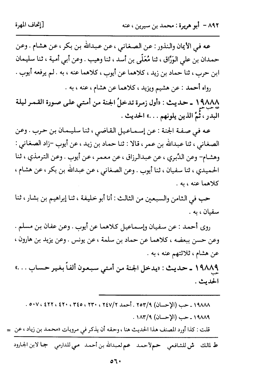 19889 - حديث (حب) : "يدخل الجنة من أمتي سبعون ألفاً بغير حساب ... " الحديث.