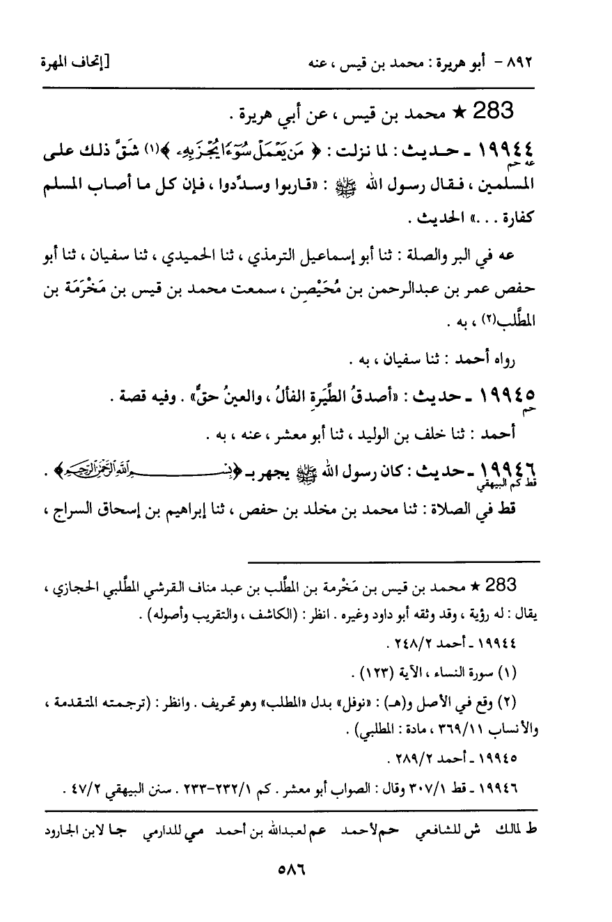 عه في البر والصلة: ثنا أبو إسماعيل الترمذي، ثنا الحميدي، ثنا سفيان، ثنا أبو حفص عمر بن عبد الرحمن بن مُحَيْصِن، سمعت محمد بن قيس بن مَخْرَمَة بن المطلب، به.