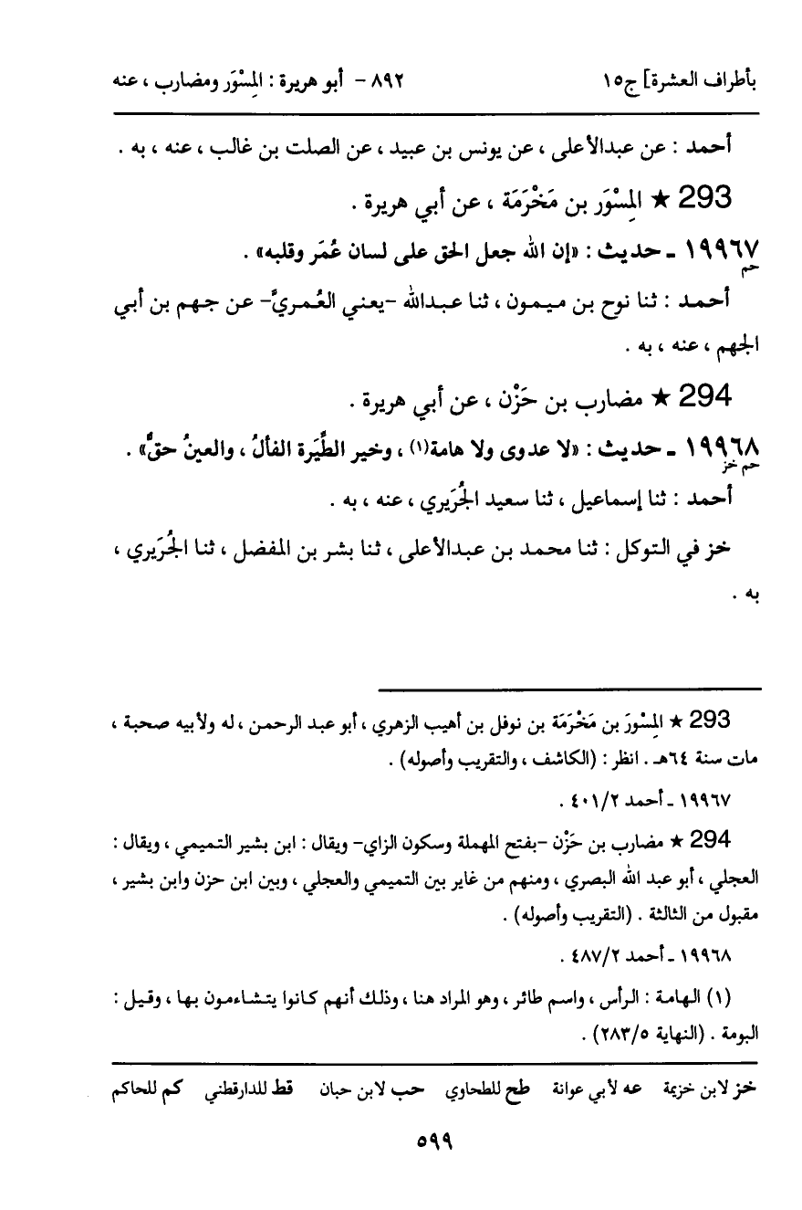 19968 - حديث (حم خز) : "لا عدوى ولا هامة، وخير الطيرة الفألُ، والعينُ حق".