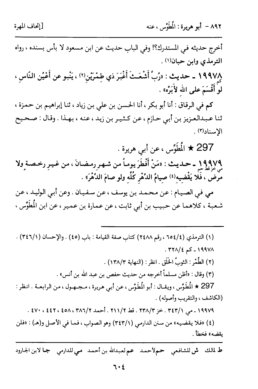19979 - حديث (مي خز قط حم) : "مَنْ أفْطَرَ يوماً من شهر رمضانَ، من غير رخصة ولا مرض، فَلا يَقْضِيهِ صِيامُ الدهْرِ كلهِ ولو صامَ الدهْرَ".