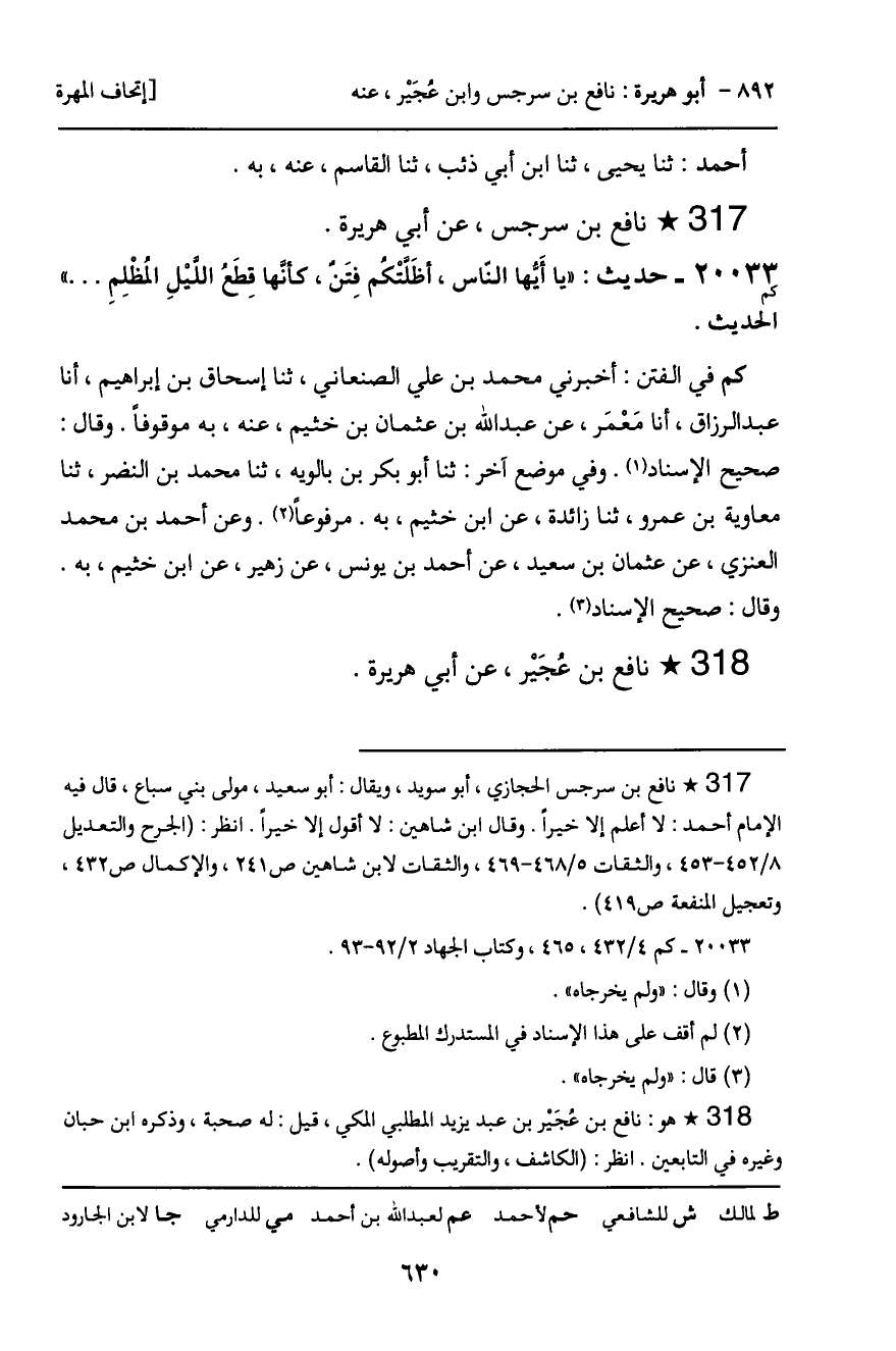 كم في الفتن: أخبرني محمد بن علي الصنعاني، ثنا إسحاق بن إبراهيم، أنا عبد الرزاق، أنا مَعْمَر، عن عبد الله بن عثمان بن خثيم، عنه، به موقوفاً. وقال: صحيح الإسناد. وفي موضع آخر: ثنا أبو بكر بن بالويه، ثنا محمد بن النضر، ثنا معاوية بن عمرو، ثنا زائدة، عن ابن خثيم، به. مرفوعاً. وعن أحمد بن محمد العنزي، عن عثمان بن سعيد، عن أحمد بن يونس، عن زهير، عن ابن خثيم، به.