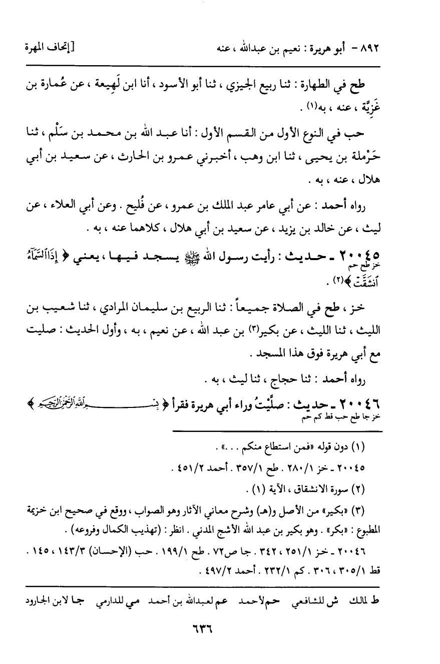 خز، طح في الصلاة جميعاً: ثنا الربيع بن سليمان المرادي، ثنا شعيب بن الليث، ثنا الليث، عن بكير بن عبد الله، عن نعيم، به، وأول الحديث: صليت مع أبي هريرة فوق هذا المسجد.