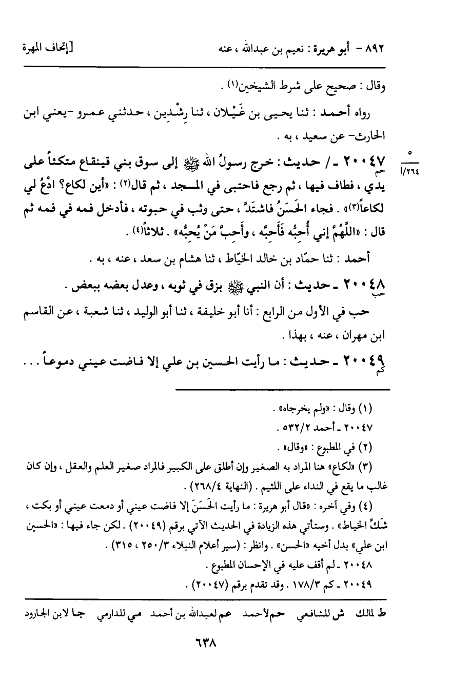 20047 - حديث (حم) : خرج رسول الله - صَلَّى اللَّهُ عَلَيْهِ وَسَلَّمَ - إلى سوق بني قينقاع متكئاً على يدي، فطاف فيها، ثم رجع فاحتبى في المسجد، ثم قال: "أين لكاع؟ ادْعُ لي لكاعاً". فجاء الحسن فاشتَد، حتى وثب في حبوته، فأدخل فمه في فمه ثم قال: "اللهم إني أحِبه فَأَحِبه، وأَحِب مَنْ يُحِبه". ثلاثاً.