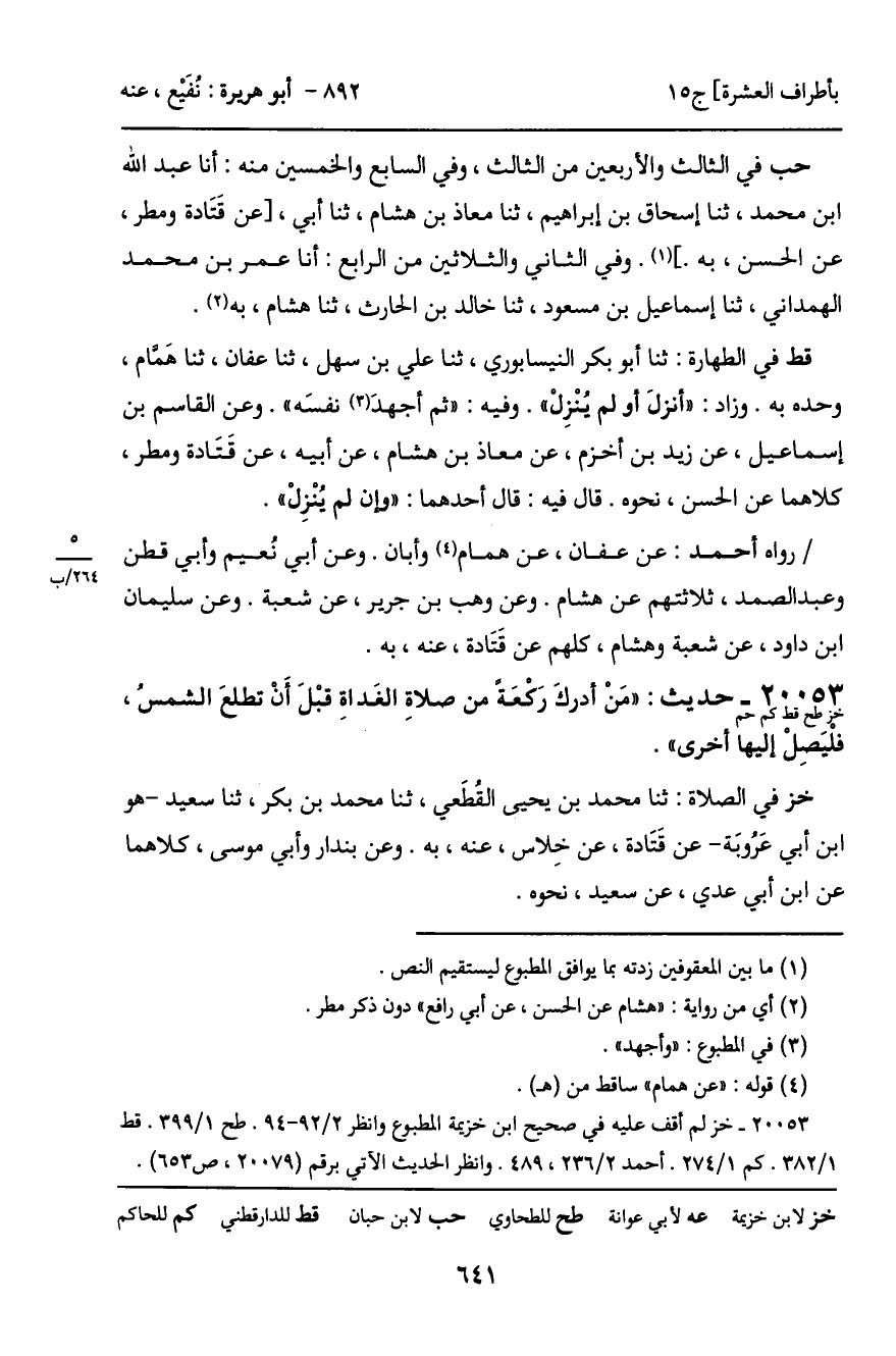 قط فيه: ثنا عمر بن أحمد بن علي المروزي، ثنا أبو النضر أحمد بن عتيق، ثنا محمد بن سنان العَوَقي. وعن أحمد بن العباس، عن أبي بدر عباد بن الوليد، عن عفان، كلاهما عن همام، عن قتادة، بمعناه.