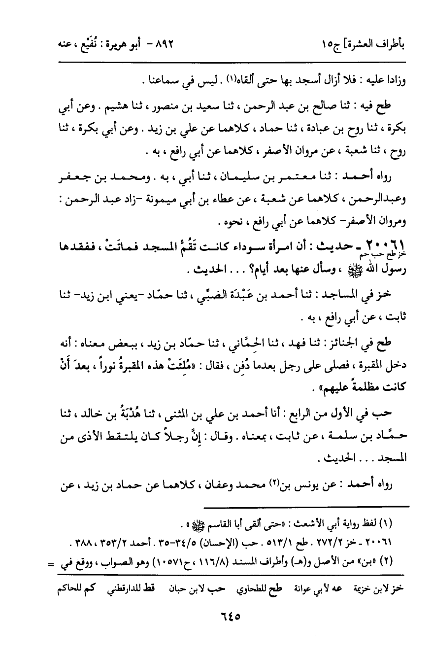 20061 - حديث (خز طح حب حم) : أن امرأة سوداء كانت تَقُمُّ المسجد فماتَتْ، ففقدها رسول الله - صَلَّى اللَّهُ عَلَيْهِ وَسَلَّمَ -، وسأل عنها بعد أيام؟ ... الحديث.