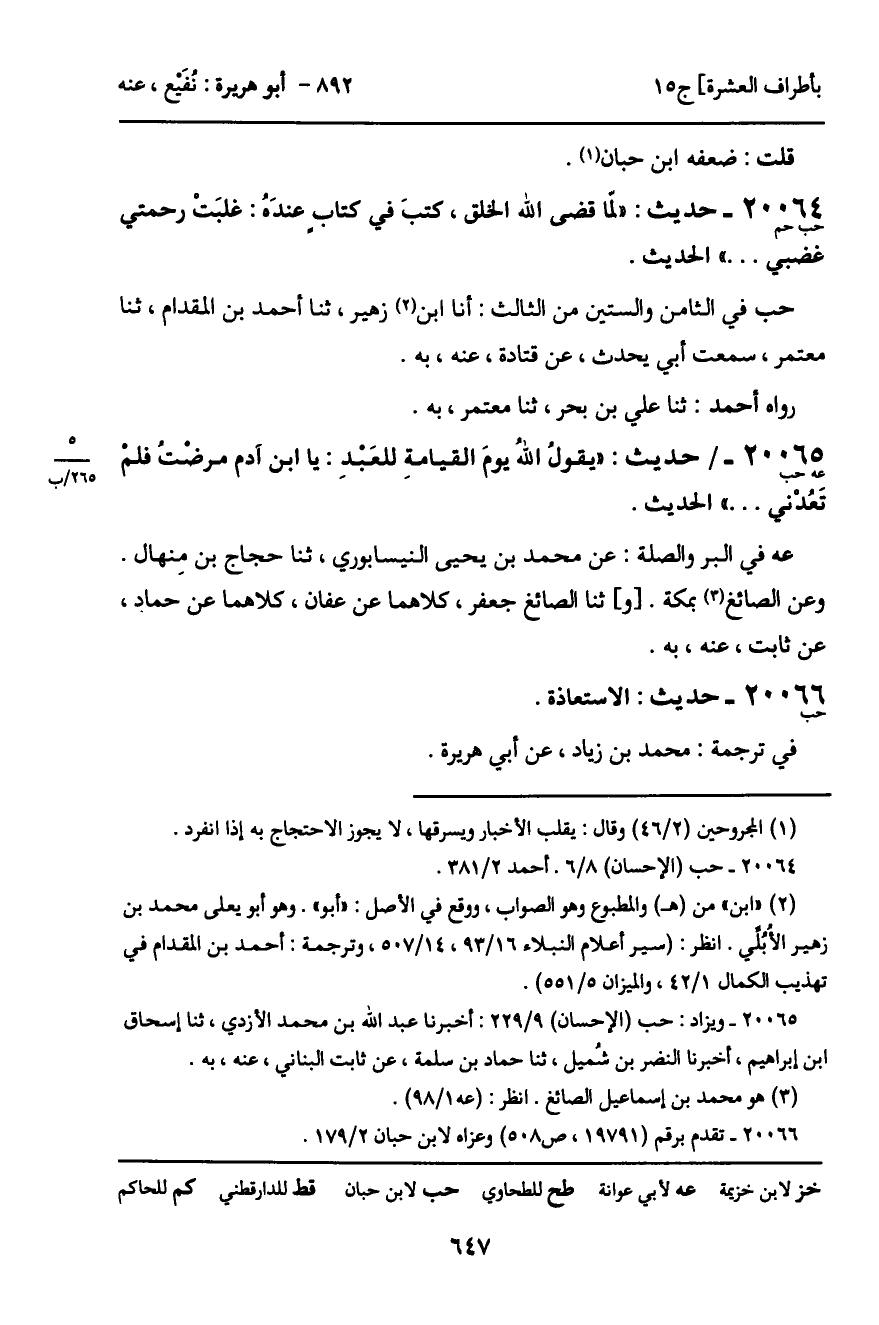 20065 - حديث (عه حب) : "يقول الله يومَ القيامةِ للعَبدِ: يا ابن آدم مرضْتُ فلمْ تَعُدْني ... " الحديث.