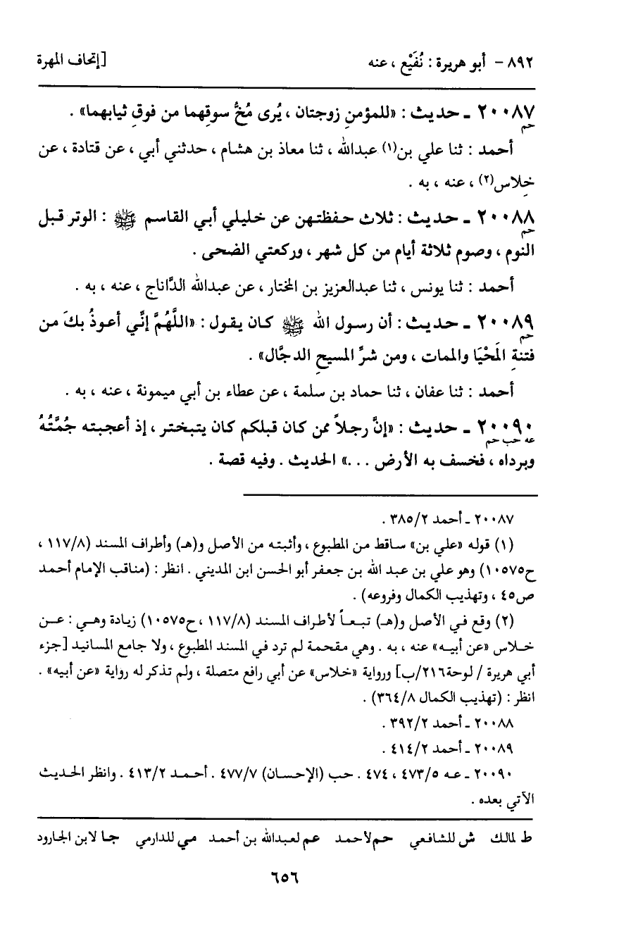 20087 - حديث (حم) : "للمؤمنِ زوجتان، يرى مُخ سوقِهما من فوقِ ثيابهما".