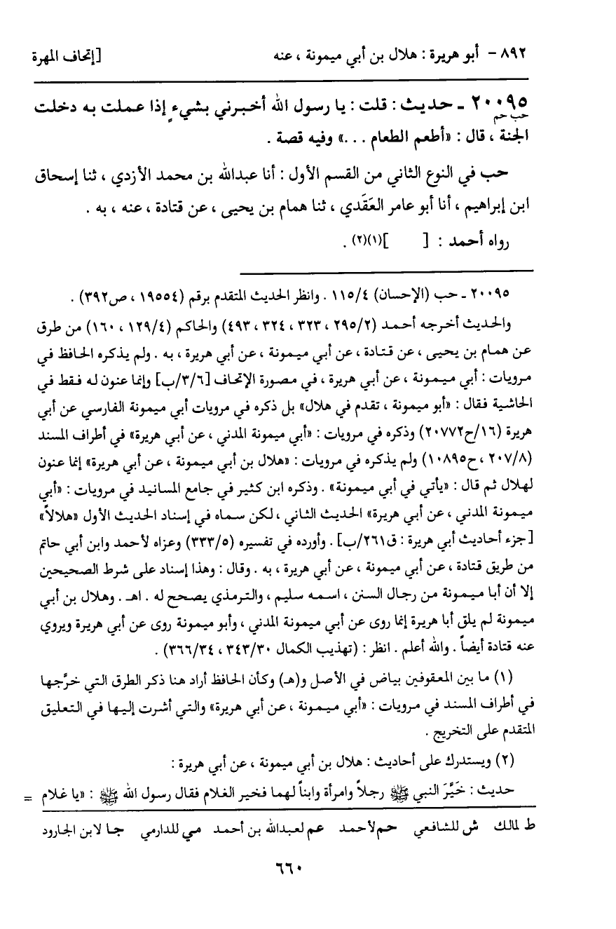 20095 - حديث (حب حم) : قلت: يا رسول الله أخبرني بشيء إذا عملت به دخلت الجنة، قال: "أطعم الطعام ... " وفيه قصة.