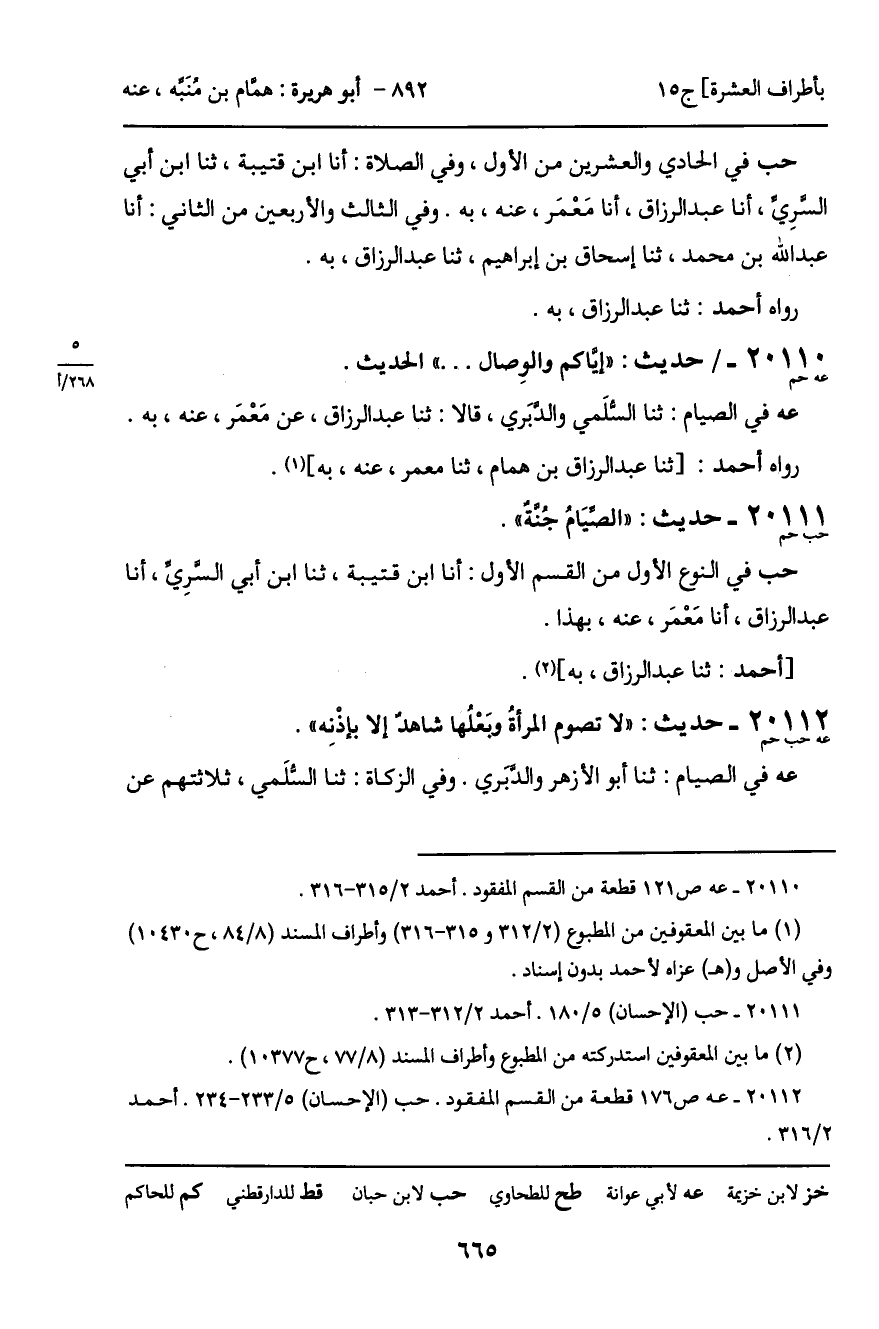 حب في النوع الأول من القسم الأول: أنا ابن قتيبة، ثنا ابن أبي السري، أنا عبد الرزاق، أنا مَعْمَر، عنه، بهذا".