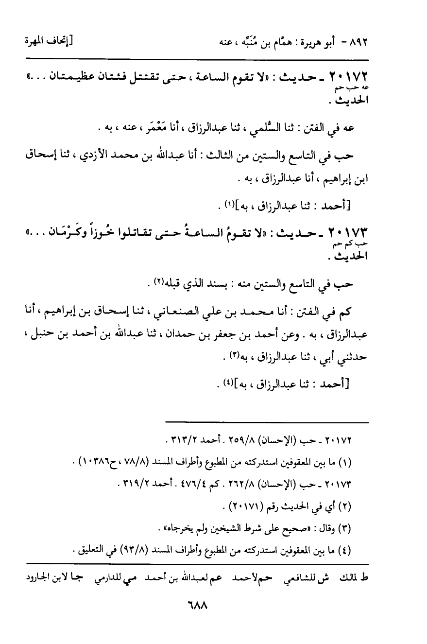 20172 - حديث (عه حب حم) : "لا تقوم الساعة، حتى تقتتل فئتان عظيمتان ... " الحديث.