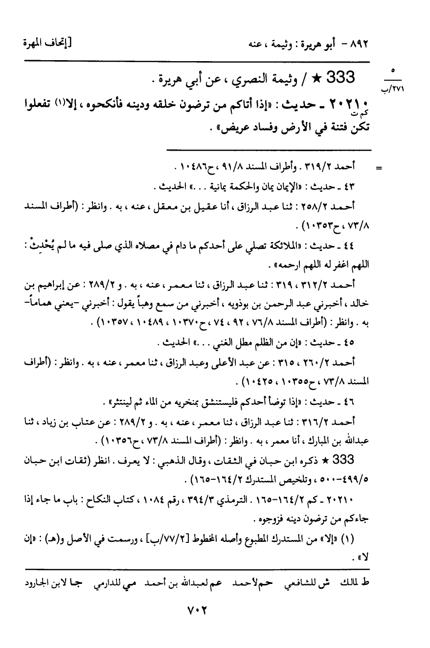 20210 - حديث (كم ت) : "إذا أتاكم من ترضون خلقه ودينه فأنكحوه، إلا تفعلوا تكن فتنة في الأرض وفساد عريض".