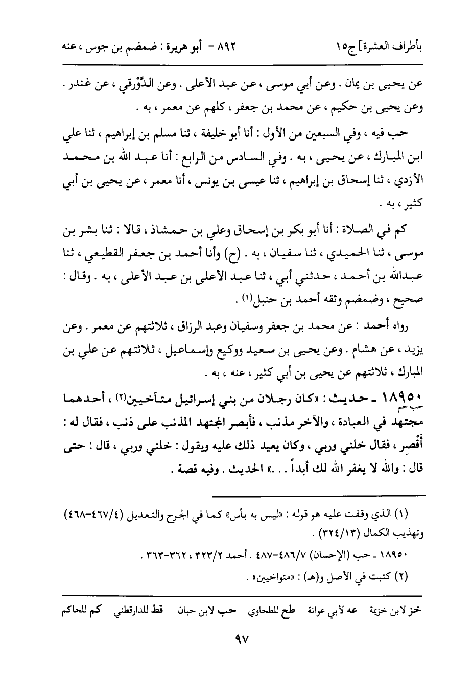 18950 - حديث (حب حم) : "كان رجلان من بنى إسرائيل متآخيين، أحدهما مجتهد في العبادة، والآخر مذنب، فأبصر المجتهد المذنب على ذنب، فقال له: أَقْصِر، فقال خلني وربي، وكان يعيد ذلك عليه ويقول: خلني وربي، قال: حتى قال: والله لا يغفر الله لك أبداً ... " الحديث. وفيه قصة.
