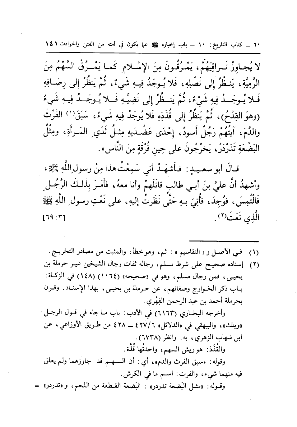 قَالَ أَبُو سَعِيدٍ: فَأَشْهَدُ أَنِّي سَمِعْتُ هَذَا مِنْ رَسُولِ اللَّهِ صَلَّى اللَّهُ عَلَيْهِ وَسَلَّمَ، وَأَشْهَدُ أَنَّ عَلِيَّ بْنَ أَبِي طَالِبٍ قَاتَلَهُمْ وَأَنَا مَعَهُ، فَأَمَرَ بِذَلِكَ الرَّجُلِ فَالْتُمِسَ، فَوُجِدَ، فَأُتِيَ بِهِ حَتَّى نَظَرْتُ إِلَيْهِ، عَلَى نَعَتَ رَسُولِ اللَّهِ صَلَّى اللَّهُ عَلَيْهِ وَسَلَّمَ الَّذِي نعت"2". [3: 69]
