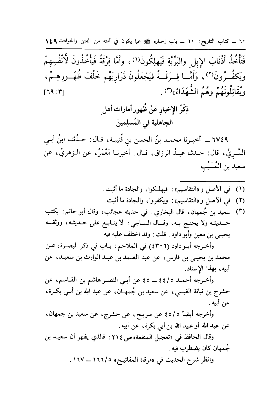6749 - أَخْبَرَنَا مُحَمَّدُ بْنُ الْحَسَنِ بْنِ قُتَيْبَةَ، قَالَ: حَدَّثَنَا ابْنُ أَبِي السَّرِيِّ، قَالَ: حَدَّثَنَا عَبْدُ الرَّزَّاقِ، قَالَ: أَخْبَرَنَا مَعْمَرٌ، عَنِ الزُّهْرِيِّ، عَنْ سعيد بن المسيبذكر الْإِخْبَارِ عَنْ ظُهُورِ أَمَارَاتِ أَهْلِ الْجَاهِلِيَّةِ فِي الْمُسْلِمِينَ