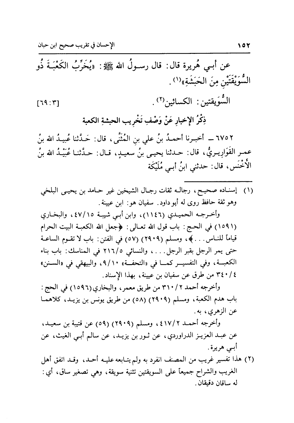 عَنْ أَبِي هُرَيْرَةَ قَالَ: قَالَ رَسُولُ اللَّهِ صَلَّى اللَّهُ عَلَيْهِ وَسَلَّمَ: "يُخَرِّبُ الْكَعْبَةَ ذُو السويقتين من الحبشة" "1".