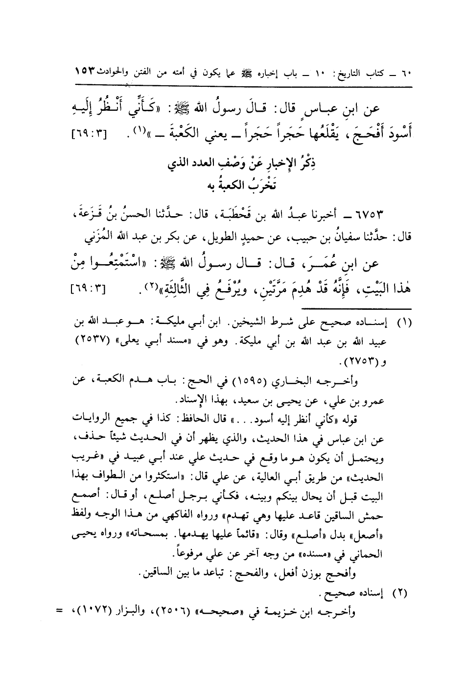 عَنِ ابْنِ عَبَّاسٍ قَالَ: قَالَ رَسُولُ اللَّهِ صَلَّى اللَّهُ عَلَيْهِ وَسَلَّمَ: "كَأَنِّي أَنْظُرُ إِلَيْهِ أَسْوَدَ أَفْحَجَ، يَقْلَعُهَا حَجَرًا حَجَرًا - يَعْنِي الْكَعْبَةَ - " "1". [3: 69]
