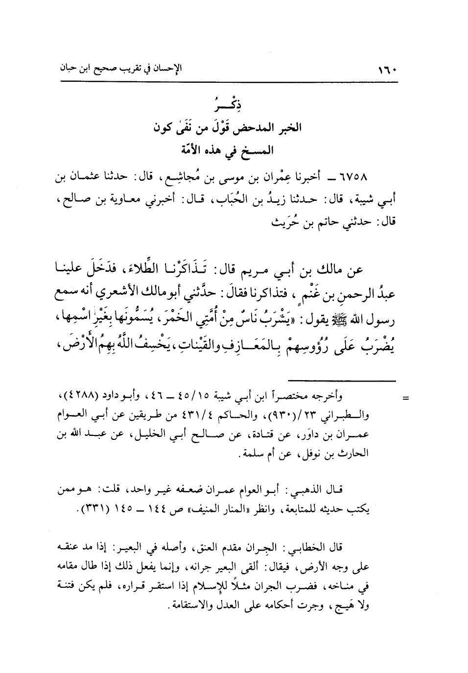 عَنْ مَالِكِ بْنِ أَبِي مَرْيَمَ قَالَ: تَذَاكَرْنَا الطِّلَاءَ، فَدَخَلَ عَلَيْنَا عَبْدُ الرَّحْمَنِ بْنُ غَنْمٍ، فَتَذَاكَرْنَا فَقَالَ: حَدَّثَنِي أَبُو مَالِكٍ الْأَشْعَرِيُّ إِنَّهُ سَمِعَ رَسُولَ اللَّهِ صَلَّى اللَّهُ عَلَيْهِ وَسَلَّمَ يَقُولُ: "يَشْرَبُ نَاسٌ مِنْ أُمَّتِي الْخَمْرَ، يُسَمُّونَهَا بِغَيْرِ اسْمِهَا، يُضْرَبُ عَلَى رؤوسهم بالمعازف والقينات، يخسف الله بهم الأرض،ذِكْرُ الْخَبَرِ الْمُدْحِضِ قَوْلَ مَنْ نَفَى كَوْنَ الْمَسْخِ فِي هَذِهِ الْأُمَّةِ