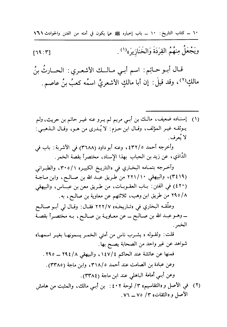 قَالَ أَبُو حَاتِمٍ: اسْمُ أَبِي مَالِكٍ الْأَشْعَرِيُّ: الْحَارِثُ بْنُ مَالِكٍ"2"، وَقَدْ قِيلَ: إِنَّ أَبَا مالك الأشعري اسمه كعب بن عاصم.