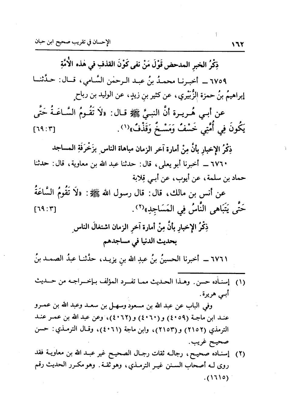 عَنْ أَبِي هُرَيْرَةَ أَنَّ النَّبِيَّ صَلَّى اللَّهُ عَلَيْهِ وَسَلَّمَ قَالَ: "لا تَقُومُ السَّاعَةُ حَتَّى يَكُونَ فِي أُمَّتِي خَسْفٌ ومسخ وقذف" "1".