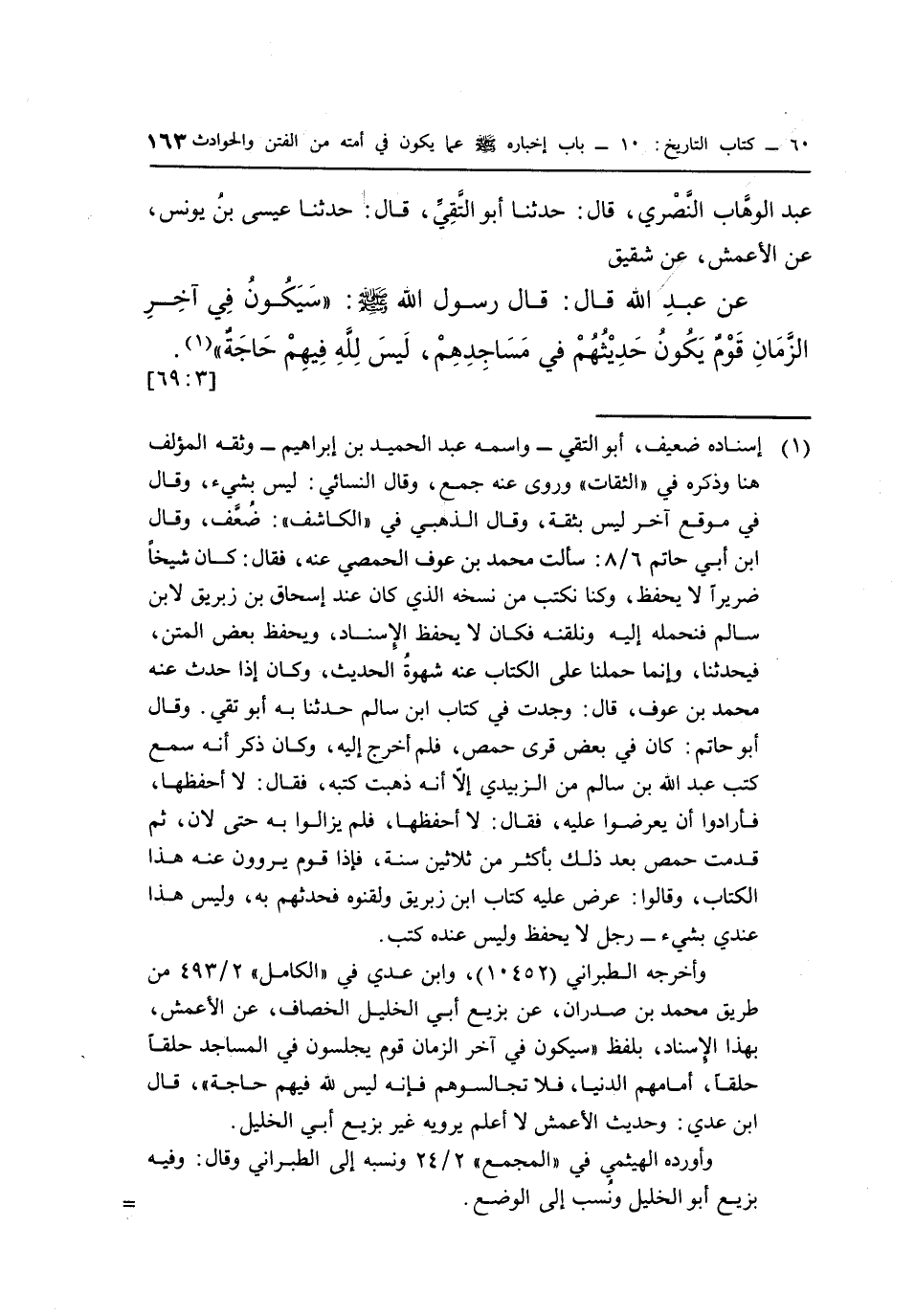 عَبْدِ الْوَهَّابِ النَّصْرِيُّ، قَالَ: حَدَّثَنَا أَبُو التَّقِيِّ، قَالَ: حَدَّثَنَا عِيسَى بْنُ يُونُسَ، عَنِ الْأَعْمَشِ، عَنْ شَقِيقٍ