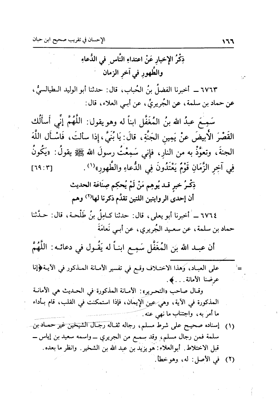 سَمِعَ عَبْدُ اللَّهِ بْنُ الْمُغَفَّلِ ابْنًا لَهُ وَهُوَ يَقُولُ: اللَّهُمَّ إِنِّي أَسْأَلُكَ الْقَصْرَ الْأَبْيَضَ عَنْ يَمِينِ الْجَنَّةِ، قَالَ: يَا بُنَيَّ، إِذَا سَأَلْتَ، فَاسْأَلِ اللَّهَ الْجَنَّةَ، وَتَعَوَّذْ بِهِ مِنَ النَّارِ، فَإِنِّي سَمِعْتُ رَسُولَ اللَّهِ صَلَّى اللَّهُ عَلَيْهِ وَسَلَّمَ يَقُولُ: "يَكُونُ فِي آخِرِ الزَّمَانِ قَوْمٌ يَعْتَدُونَ فِي الدُّعَاءِ وَالطُّهُورِ" "1". [3: 69]