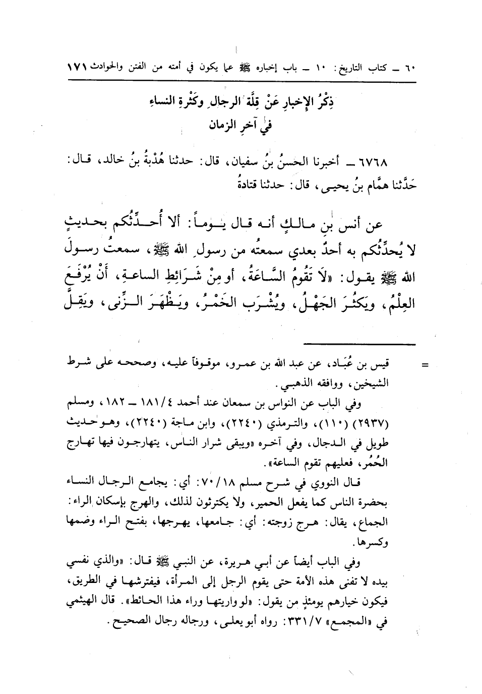 عَنْ أَنَسِ بْنِ مَالِكٍ أَنَّهُ قَالَ يَوْمًا: أَلَا أُحَدِّثُكُمْ بِحَدِيثٍ لَا يُحَدِّثُكُمْ بِهِ أَحَدٌ بَعْدِي سَمِعْتُهُ مِنْ رَسُولِ اللَّهِ صَلَّى اللَّهُ عَلَيْهِ وَسَلَّمَ، سَمِعْتُ رَسُولَ اللَّهِ صَلَّى اللَّهُ عَلَيْهِ وَسَلَّمَ يَقُولُ: "لَا تَقُومُ السَّاعَةُ، أَوْ مِنْ شَرَائِطِ السَّاعَةِ، أَنْ يُرْفَعَ الْعِلْمُ، وَيَكْثُرَ الْجَهْلُ، ويشرب الخمر، ويظهر الزنى، ويقلذكر الْإِخْبَارِ عَنْ قِلَّةِ الرِّجَالِ وَكَثْرَةِ النِّسَاءِ فِي آخِرِ الزَّمَانِ