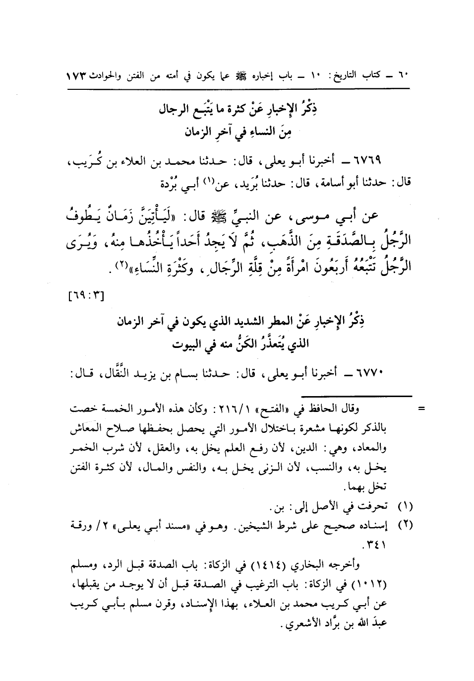 عَنْ أَبِي مُوسَى، عَنِ النَّبِيِّ صَلَّى اللَّهُ عَلَيْهِ وَسَلَّمَ قَالَ: "لَيَأْتِيَنَّ زَمَانٌ يَطُوفُ الرَّجُلُ بِالصَّدَقَةِ مِنَ الذَّهَبِ، ثُمَّ لَا يَجِدُ أَحَدًا يَأْخُذُهَا مِنْهُ، وَيُرَى الرَّجُلُ تَتْبَعُهُ أَرْبَعُونَ امْرَأَةً مِنْ قِلَّةِ الرِّجَالِ، وكثرة النساء" "2". [3: 69]
