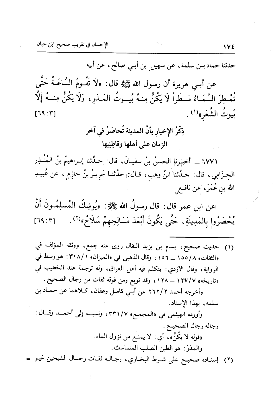 عَنِ ابْنِ عُمَرَ قَالَ: قَالَ رَسُولُ اللَّهِ صَلَّى اللَّهُ عَلَيْهِ وَسَلَّمَ: "يُوشِكُ الْمُسْلِمُونَ أَنْ يُحَصَرُوا بالمدينة، حتى يكون أبعد مسالحهم سلاح" "2". [3: 69]