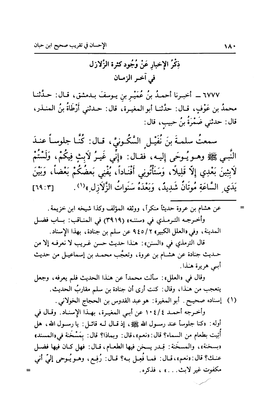 سَمِعْتُ سَلَمَةَ بْنَ نُفَيْلٍ السَّكُونِيَّ، قَالَ: "كُنَّا جُلُوسًا عِنْدَ النَّبِيِّ صَلَّى اللَّهُ عَلَيْهِ وَسَلَّمَ وَهُوَ يُوحَى إِلَيْهِ، فَقَالَ: إِنِّي غَيْرُ لَابِثٍ فِيكُمْ، وَلَسْتُمْ لَابِثِينَ بَعْدِي إِلَّا قَلِيلًا، وستأتوني أفنادا، يفني بعضكم بضعا، وَبَيْنَ يَدَيِ السَّاعَةِ مَوْتَانٌ شَدِيدٌ، وَبَعْدَهُ سَنَوَاتُ الزلازل" "1". [3: 69]