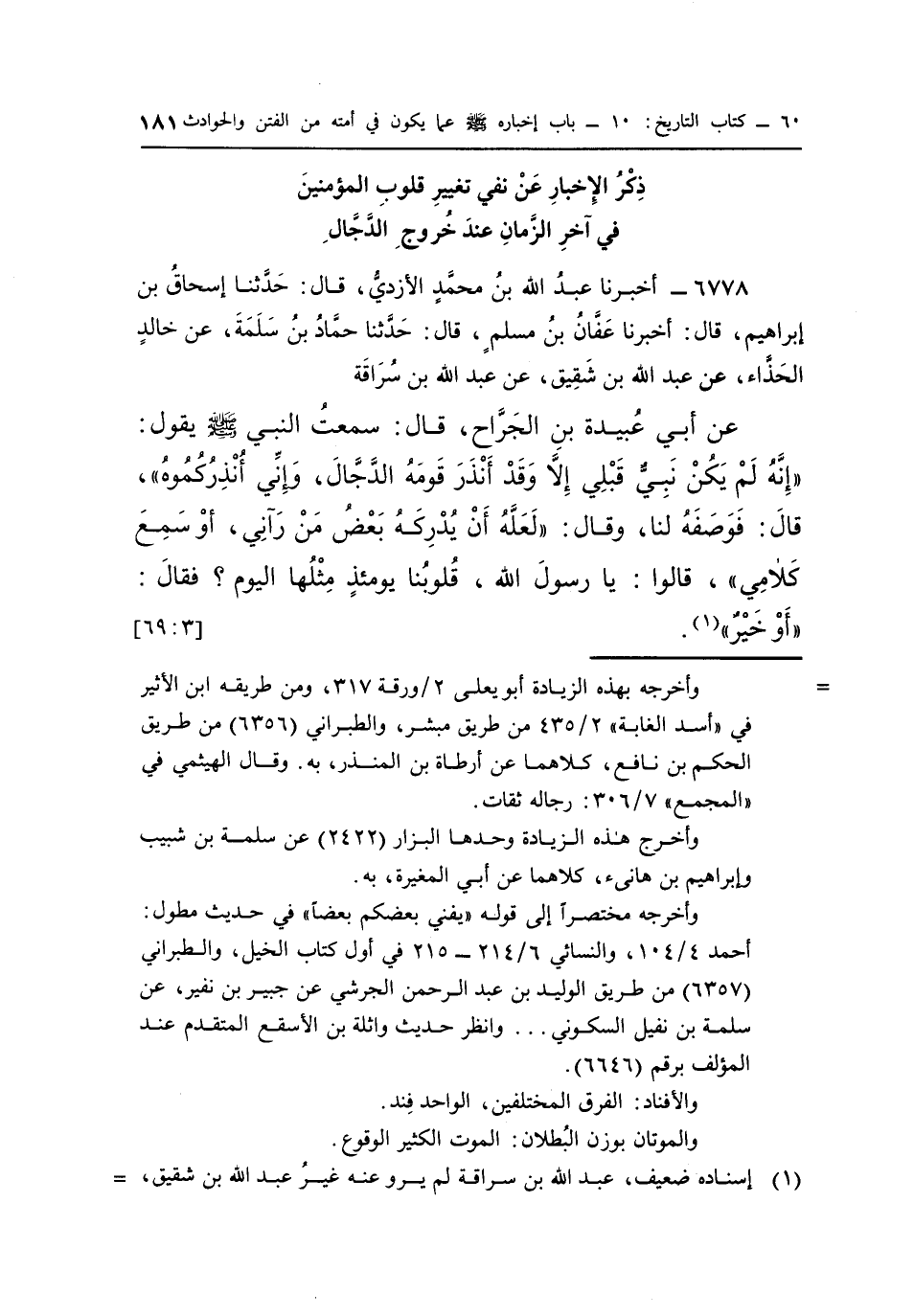 عَنْ أَبِي عُبَيْدَةَ بْنِ الْجَرَّاحِ، قَالَ: سَمِعْتُ النَّبِيَّ صَلَّى اللَّهُ عَلَيْهِ وَسَلَّمَ يَقُولُ: "إِنَّهُ لَمْ يَكُنْ نَبِيٌّ قَبْلِي إِلَّا وَقَدْ أَنْذَرَ قَوْمَهُ الدَّجَّالَ، وَإِنِّي أُنْذِرُكُمُوهُ"، قَالَ: فَوَصَفَهُ لَنَا، وَقَالَ: "لَعَلَّهُ أَنْ يُدْرِكَهُ بَعْضُ مَنْ رَآنِي، أَوْ سَمِعَ كَلَامِي"، قَالُوا: يَا رَسُولَ اللَّهِ، قُلُوبُنَا يَوْمَئِذٍ مثلها اليوم؟ فقال: "أو خير" "1". [3: 69]