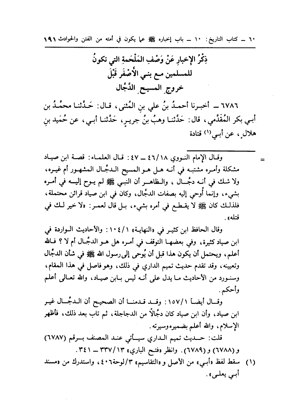 ذِكْرُ الْإِخْبَارِ عَنْ وَصْفِ الْمَلْحَمَةِ الَّتِي تَكُونُ لِلْمُسْلِمِينَ مَعَ بَنِي الْأَصْفَرِ قَبْلَ خُرُوجِ الْمَسِيحِ الدَّجَّالِ