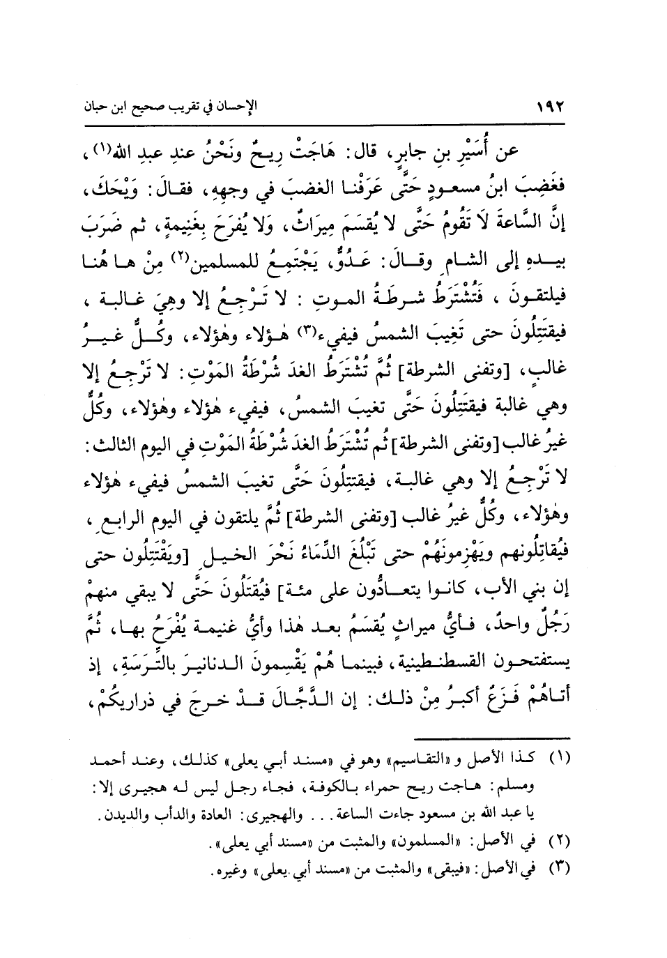 عَنْ أُسَيْرِ بْنِ جَابِرٍ، قَالَ: هَاجَتْ رِيحٌ وَنَحْنُ عِنْدَ عَبْدِ اللَّهِ "1"، فَغَضِبَ ابْنُ مَسْعُودٍ حَتَّى عَرَفْنَا الْغَضَبَ فِي وَجْهِهِ، فَقَالَ: وَيْحَكَ إِنَّ السَّاعَةَ لَا تَقُومُ حَتَّى لَا يُقْسَمَ مِيرَاثٌ، وَلَا يُفْرَحَ بِغَنِيمَةٍ، ثُمَّ ضَرَبَ بِيَدِهِ إِلَى الشَّامِ وَقَالَ: عَدُوٌّ يَجْتَمِعُ لِلْمُسْلِمِينَ"2" مِنْ ها هنا فَيَلْتَقُونَ، فَتُشْتَرَطُ شُرْطَةُ الْمَوْتِ: لَا تَرْجِعُ إِلَّا وهي غالبة، فيقتتلون حتى تغيب الشمس فيفيء "3" هؤلاء وهؤلاء، وكل غير غالب،" وتفنى الشرطة" ثُمَّ تُشْتَرَطُ الْغَدَ شُرْطَةُ الْمَوْتِ: لَا تَرْجِعُ إلا وهي غالبة فيقتتلون حتى تغيب الشمس، فيفيء هؤلاء وهؤلاء، وكل غير غالب، "وتفنى الشُّرْطَةُ" ثُمَّ تُشْتَرَطُ الْغَدَ شُرْطَةُ الْمَوْتِ فِي الْيَوْمِ الثَّالِثِ: لَا تَرْجِعُ إِلَّا وَهِيَ غَالِبَةً، فيقتتلون حتى تغيب الشمس فيفيء هؤلاء وهؤلاء، وَكُلٌّ غَيْرُ غَالِبٍ "وَتُفْنَى الشُّرْطَةُ" ثُمَّ يَلْتَقُونَ فِي الْيَوْمِ الرَّابِعِ، فَيُقَاتِلُونَهُمْ وَيَهْزِمُونَهُمْ حَتَّى تَبْلُغَ الدِّمَاءُ نَحْرَ الْخَيْلِ" وَيَقْتَتِلُونَ حَتَّى إِنَّ بَنِي الْأَبِ، كَانُوا يَتَعَادُّونَ عَلَى مِائَةٍ" فَيُقْتَلُونَ حَتَّى لَا يَبْقَى مِنْهُمْ رَجُلٌ وَاحِدٌ، فَأَيُّ مِيرَاثٍ يُقْسَمُ بَعْدَ هَذَا وَأَيُّ غَنِيمَةٍ يُفْرَحُ بِهَا، ثُمَّ يَسْتَفْتِحُونَ الْقُسْطَنْطِينِيَّةَ، فَبَيْنَمَا هُمْ يَقْسِمُونَ الدَّنَانِيرَ بالترسة، إذا أَتَاهُمْ فَزَعٌ أَكْبَرُ مِنْ ذَلِكَ: إِنَّ الدَّجَّالَ قد خرج في ذراريكم،
