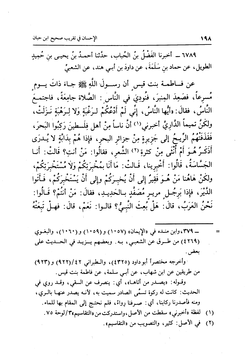 6789 - أَخْبَرَنَا الْفَضْلُ بْنُ الْحُبَابِ، حَدَّثَنَا أَحْمَدُ بْنُ يَحْيَى بْنِ حُمَيْدٍ الطَّوِيلُ، عَنْ حَمَّادُ بْنُ سَلَمَةَ، عَنْ دَاوُدَ بْنِ أَبِي هِنْدٍ، عَنِ الشَّعْبِيِّ