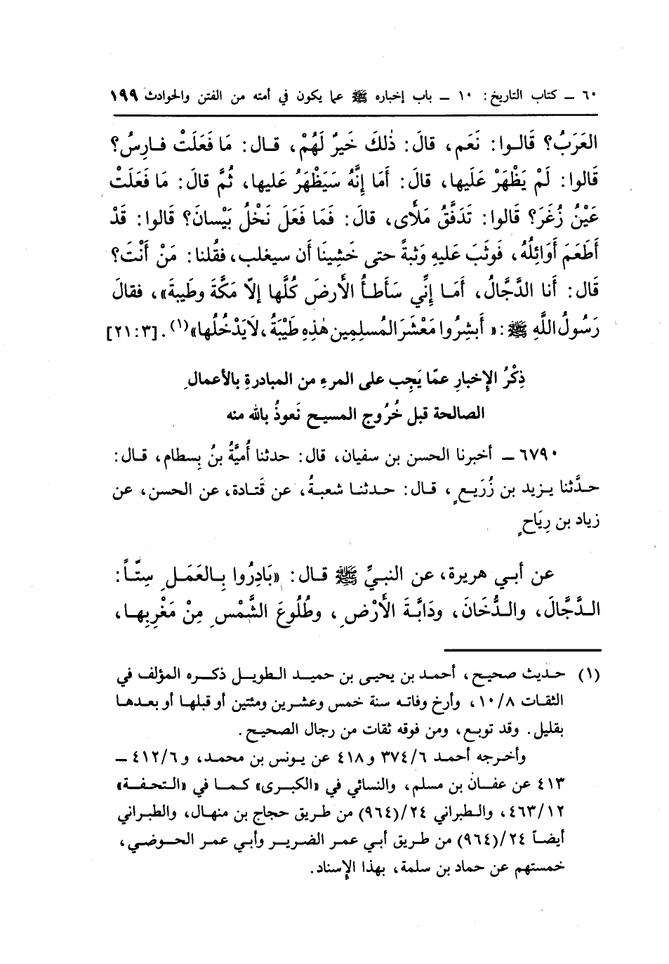 عَنْ أَبِي هُرَيْرَةَ، عَنِ النَّبِيِّ صَلَّى اللَّهُ عَلَيْهِ وَسَلَّمَ قَالَ: "بَادِرُوا بِالْعَمَلِ سِتًّا: الدَّجَّالَ، وَالدُّخَانَ، ودابة الأرض، وطلوع الشمس من مغربها، ذِكْرُ الْإِخْبَارِ عَمَّا يَجِبُ عَلَى الْمَرْءِ مِنْ الْمُبَادَرَةِ بِالْأَعْمَالِ الصَّالِحَةِ قَبْلَ خُرُوجِ الْمَسِيحِ نَعُوذُ بِاللَّهِ مِنْهُ