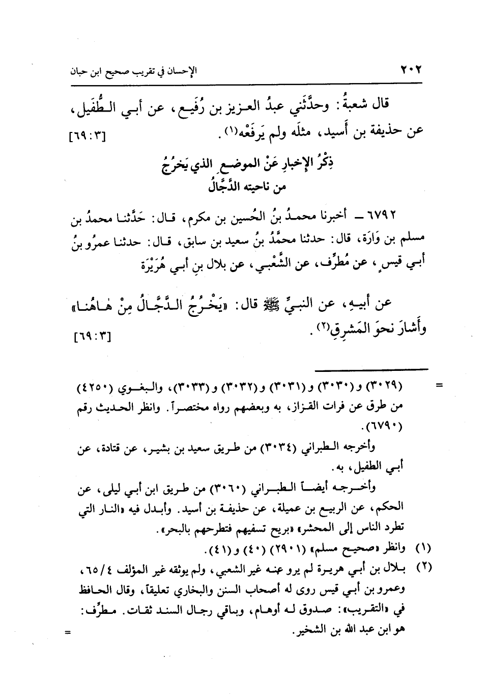 "2" بلال بن أبي هريرة لم يرو عنه غير الشعبي، ولم يوثقه غير المؤلف4/65، وعمرو بن أبي قيس روى له أصحاب السنن والبخاري تعليقا، وقال الحافظ في "التقريب": صدوق له أوهام، وباقي رجال السند ثقات. مطرف: هو ابن عبد الله بن الشخير. وأخرجه بنحوه البزار "3383" عن ممد بن المثنى، ن يحيى - وهو القطان - عن مجالد، عَنِ الشَّعْبِيِّ، عَنِ الْمُحَرَّرِ بْنِ أَبِي هُرَيْرَةَ، عن أبيه قال: سئل رسول الله عن الدجال فقال: - أحسبه قال -: "يخرج من نحو المشرق".