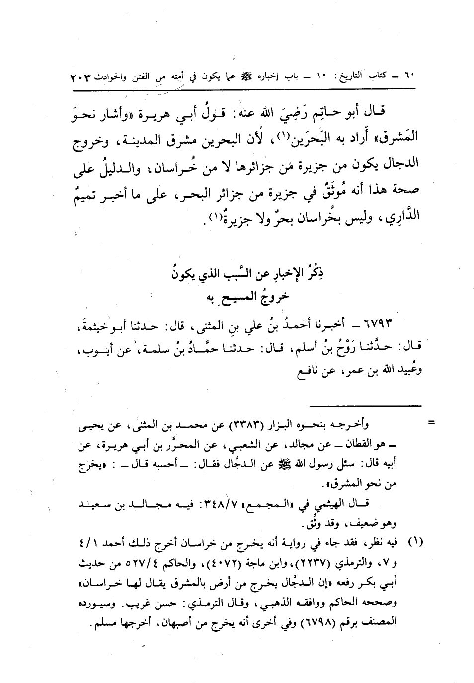 قَالَ أَبُو حَاتِمٍ رَضِيَ اللَّهُ عَنْهُ: قَوْلُ أَبِي هُرَيْرَةَ "وَأَشَارَ نَحْوَ الْمَشْرِقِ" أَرَادَ بِهِ الْبَحْرَيْنِ"1"، لِأَنَّ الْبَحْرَيْنِ مَشْرِقُ الْمَدِينَةِ، وَخُرُوجُ الدَّجَّالِ يَكُونُ مِنْ جَزِيرَةٍ مِنْ جَزَائِرِهَا لَا مِنْ خُرَاسَانَ، وَالدَّلِيلُ عَلَى صِحَّةِ هَذَا أَنَّهُ مُوثَقٌ فِي جَزِيرَةٍ مِنْ جَزَائِرِ الْبَحْرِ، عَلَى مَا أَخْبَرَ تَمِيمٌ الدَّارِيُّ، وَلَيْسَ بِخُرَاسَانَ بَحْرٌ وَلَا جزيرة "2".