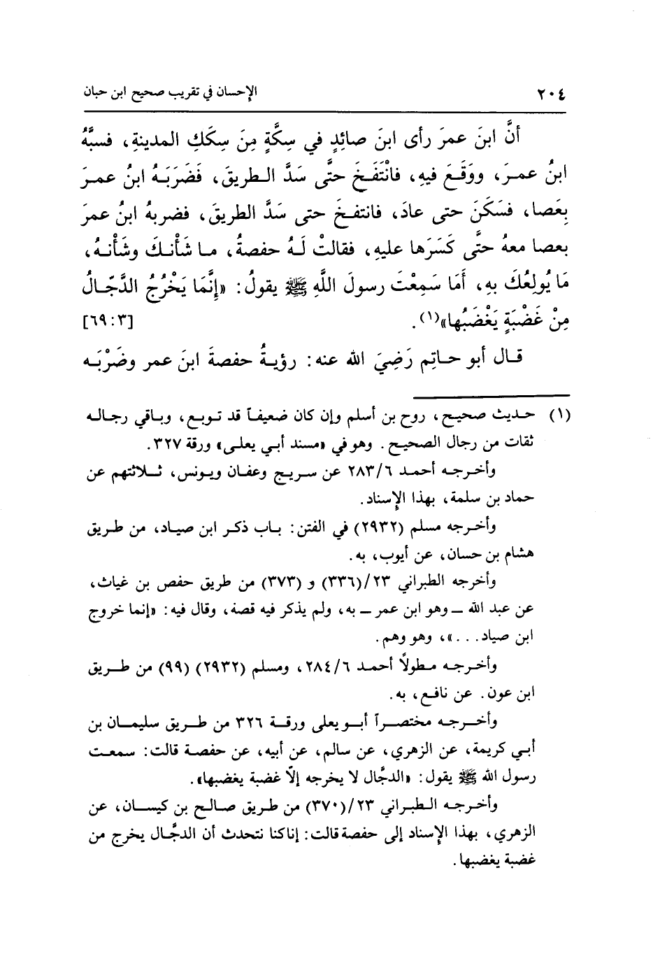 أن ابن عمر رأى بن صَائِدٍ فِي سِكَّةٍ مِنْ سِكَكِ الْمَدِينَةِ، فَسَبَّهُ ابْنُ عُمَرَ، وَوَقَعَ فِيهِ، فَانْتَفَخَ حَتَّى سَدَّ الطَّرِيقَ، فَضَرَبَهُ ابْنُ عُمَرَ بِعَصًا، فَسَكَنَ حَتَّى عَادَ، فَانْتَفَخَ حَتَّى سَدَّ الطَّرِيقَ، فَضَرَبَهُ ابْنُ عُمَرَ بِعَصًا مَعَهُ حَتَّى كَسَرَهَا عَلَيْهِ، فَقَالَتْ لَهُ حَفْصَةُ، مَا شَأْنُكَ وَشَأْنُهُ، مَا يُولِعُكَ بِهِ، أَمَا سَمِعْتُ رَسُولَ اللَّهِ صَلَّى اللَّهُ عَلَيْهِ وَسَلَّمَ يَقُولُ: " إِنَّمَا يَخْرُجُ الدَّجَّالُ مِنْ غَضْبَةٍ يَغْضَبُهَا" "1". [3: 69]