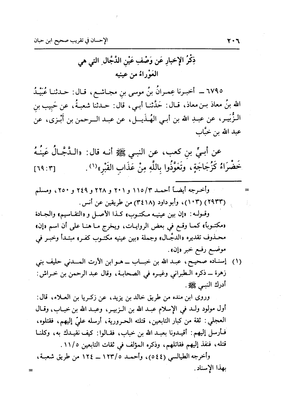 عَنْ أَبِي بْنُ كَعْبٍ، عَنِ النَّبِيِّ صَلَّى اللَّهُ عَلَيْهِ وَسَلَّمَ أَنَّهُ قَالَ: "الدَّجَّالُ عَيْنُهُ خَضْرَاءُ كَزُجَاجَةٍ، وَتَعَوَّذُوا بِاللَّهِ مِنْ عذاب القبر" "1". [3: 69]