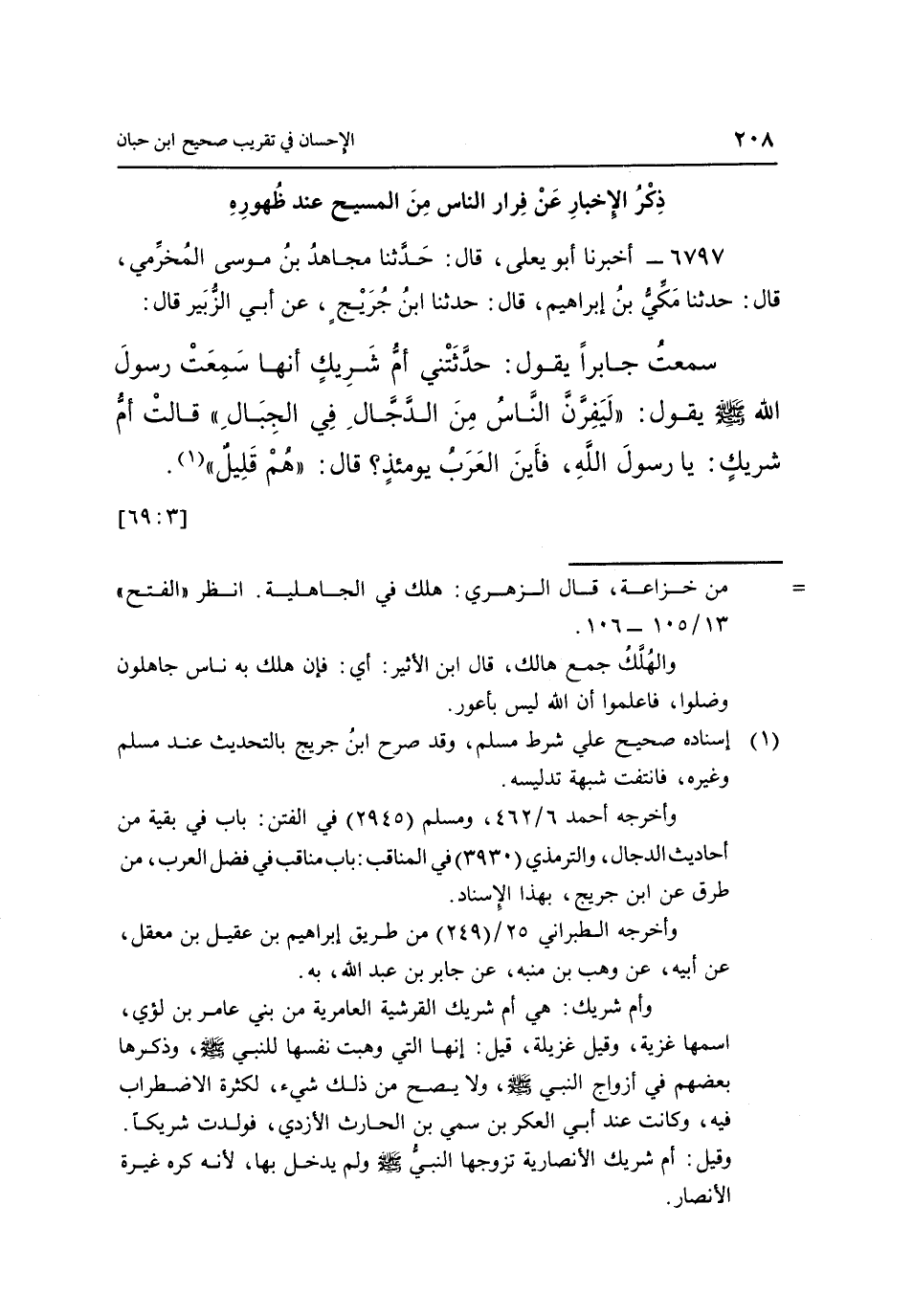 سَمِعْتُ جَابِرًا يَقُولُ: حَدَّثَتْنِي أُمُّ شَرِيكٍ أَنَّهَا سَمِعَتْ رَسُولَ اللَّهِ صَلَّى اللَّهُ عَلَيْهِ وَسَلَّمَ يَقُولُ: "لَيَفِرَّنَّ النَّاسُ مِنَ الدَّجَّالِ فِي الْجِبَالِ" قَالَتْ أُمُّ شَرِيكٍ: يَا رَسُولَ اللَّهِ، فَأَيْنَ الْعَرَبُ يَوْمَئِذٍ، قَالَ: "هُمْ قليل" "1". [3: 69]