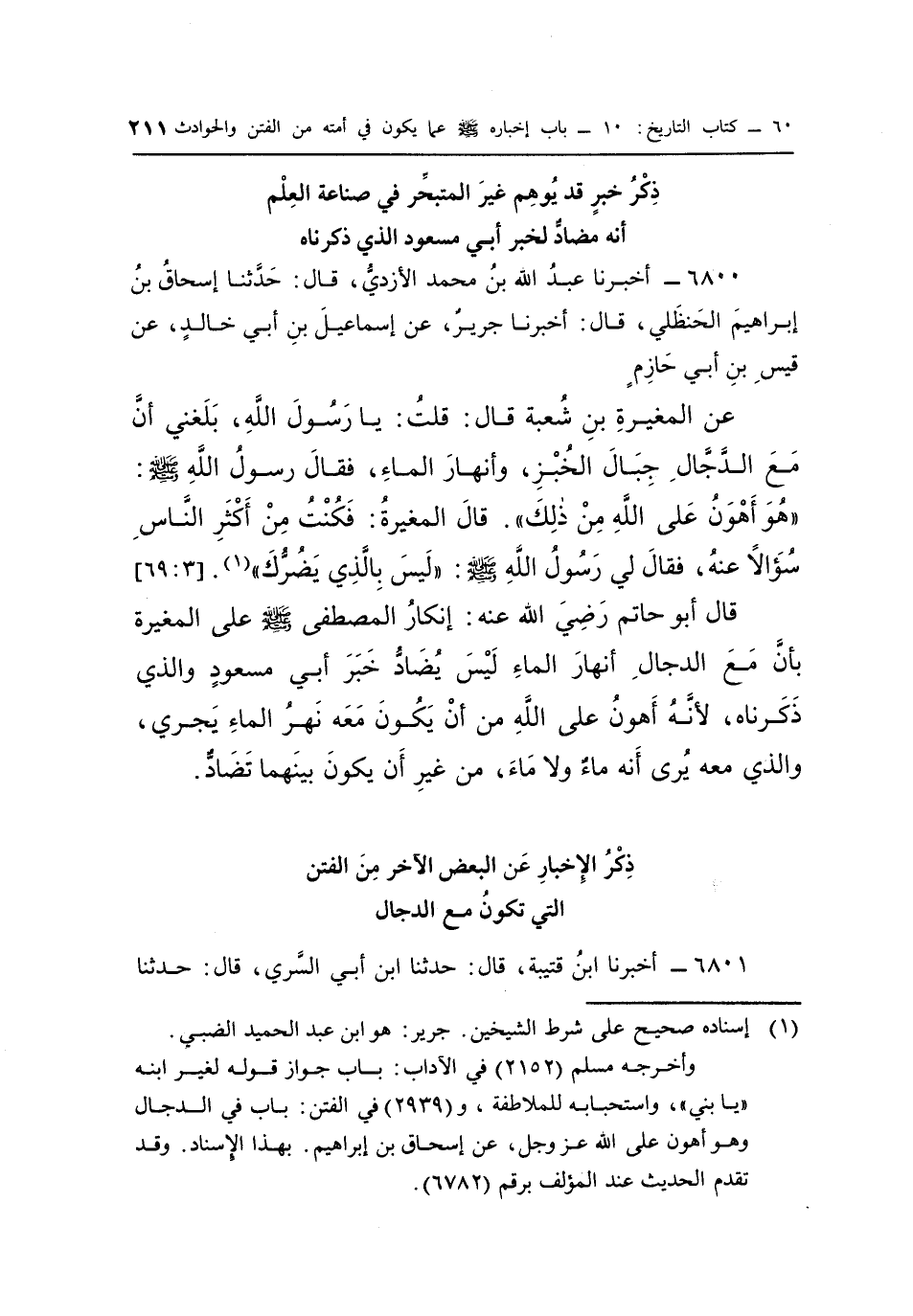 قَالَ أَبُو حَاتِمٍ رَضِيَ اللَّهُ عَنْهُ: إِنْكَارِ الْمُصْطَفَى صَلَّى اللَّهُ عَلَيْهِ وَسَلَّمَ عَلَى الْمُغِيرَةِ بِأَنَّ مَعَ الدَّجَّالِ أَنْهَارُ الْمَاءِ لَيْسَ يُضَادُّ خَبَرَ أبي مسعود والذي ذَكَرْنَاهُ، لِأَنَّهُ أَهْوَنُ عَلَى اللَّهِ مِنْ أَنْ يَكُونَ مَعَهُ نَهْرُ الْمَاءِ يَجْرِي وَالَّذِي مَعَهُ يُرَى أَنَّهُ مَاءٌ وَلَا مَاءَ، مِنْ غَيْرِ أن يكون بينهما تضاد.