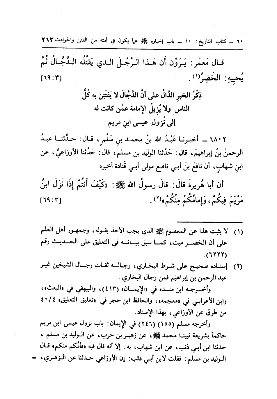 أَنَّ أَبَا هُرَيْرَةَ قَالَ: قَالَ رَسُولُ اللَّهِ صَلَّى اللَّهُ عَلَيْهِ وَسَلَّمَ: "كيف أنتم إذا نزل بن مريم فيكم، وإمامكم منكم" "2". [3: 69]
