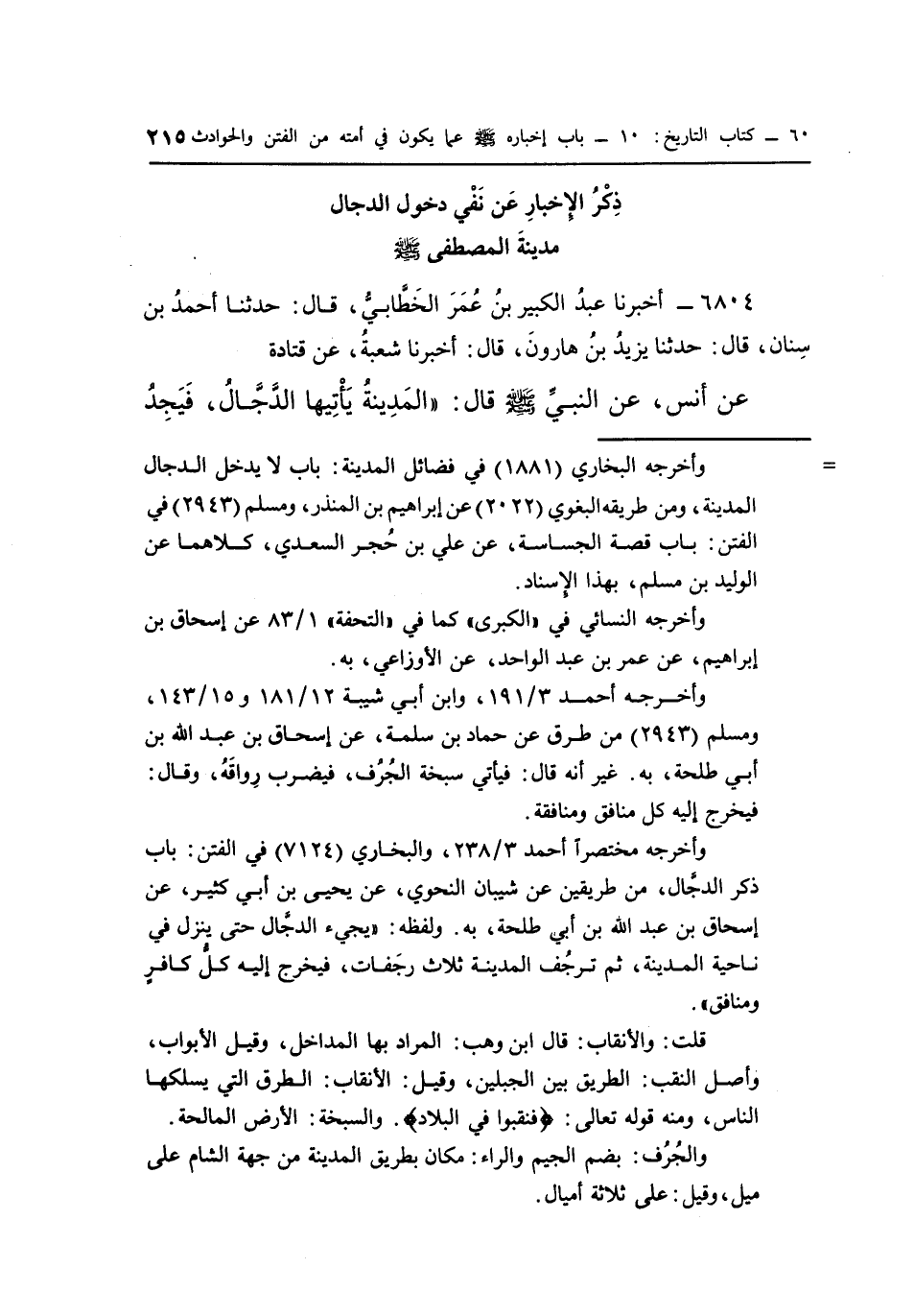 عَنْ أَنَسٍ، عَنِ النَّبِيِّ صَلَّى اللَّهُ عَلَيْهِ وَسَلَّمَ قَالَ: "الْمَدِينَةُ يَأْتِيهَا الدَّجَّالُ، فَيَجِدُ