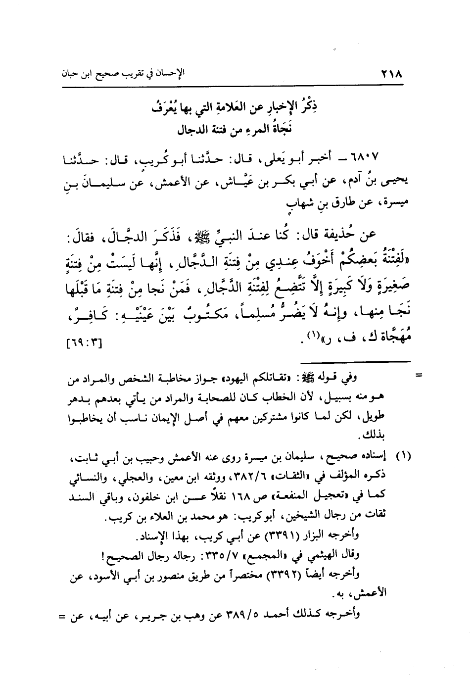 عَنْ حُذَيْفَةَ قَالَ: كُنَّا عِنْدَ النَّبِيِّ صَلَّى اللَّهُ عَلَيْهِ وَسَلَّمَ، فَذَكَرَ الدَّجَّالَ، فَقَالَ: "لَفِتْنَةُ بَعْضِكُمْ أَخْوَفُ عِنْدِي مِنْ فِتْنَةِ الدَّجَّالِ، إِنَّهَا لَيْسَتْ مِنْ فِتْنَةٍ صَغِيرَةٍ وَلَا كَبِيرَةٍ إِلَّا تَتَّضِعُ لِفِتْنَةِ الدَّجَّالِ، فَمَنْ نَجَا مِنْ فِتْنَةِ مَا قَبْلَهَا نَجَا مِنْهَا، وَإِنَّهُ لَا يَضُرُّ مُسْلِمًا، مَكْتُوبٌ بَيْنَ عينيه: كافر، مهجاة ك، ف، ر" "1". [3: 69]