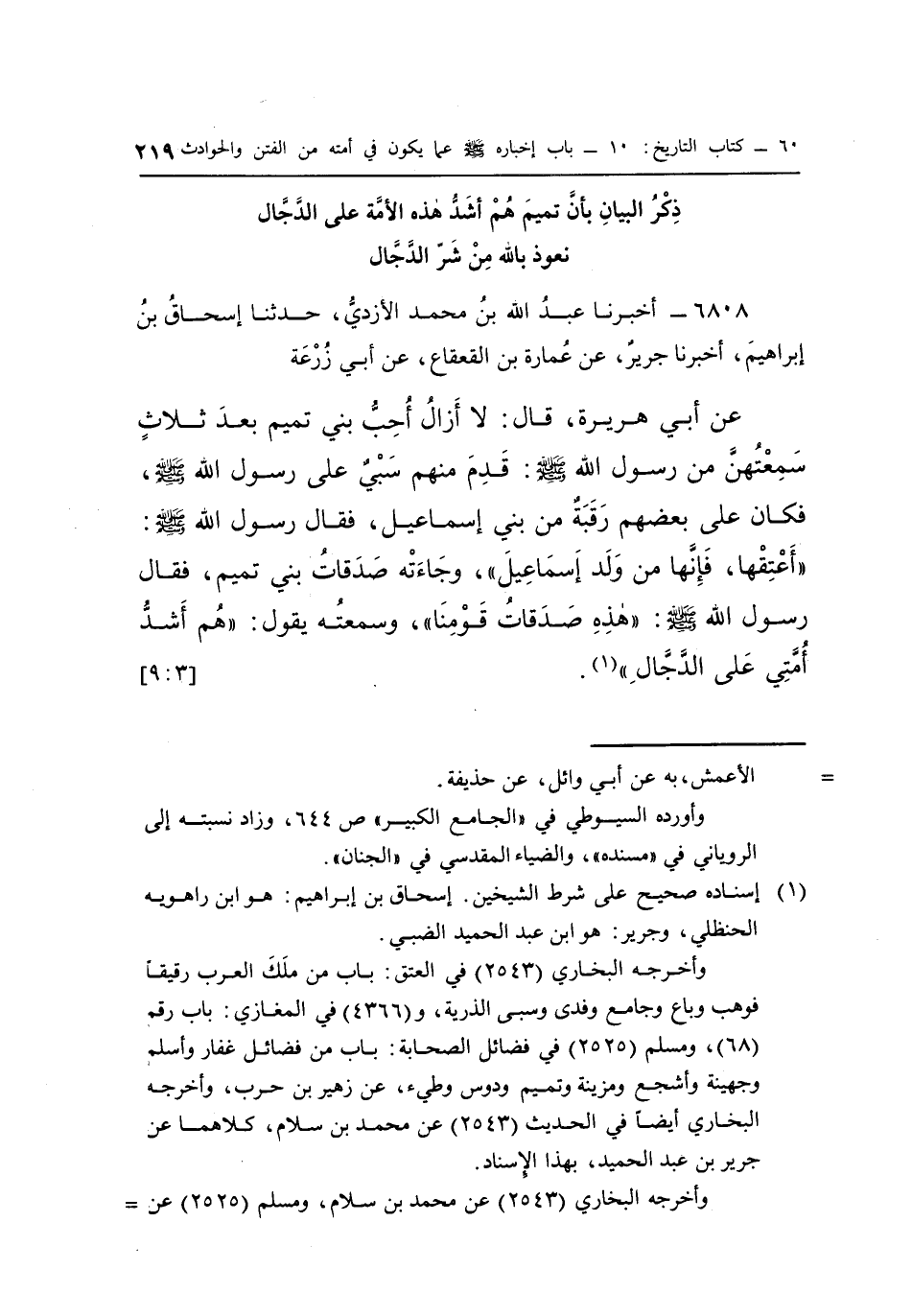 عَنْ أَبِي هُرَيْرَةَ، قَالَ: لَا أَزَالُ أُحِبُّ بَنِي تَمِيمٍ بَعْدَ ثَلَاثٍ سَمِعْتُهُنَّ مِنْ رَسُولِ اللَّهِ صَلَّى اللَّهُ عَلَيْهِ وَسَلَّمَ: قَدِمَ مِنْهُمْ سَبْيٌ عَلَى رَسُولِ اللَّهِ صَلَّى اللَّهُ عَلَيْهِ وَسَلَّمَ، فَكَانَ عَلَى بَعْضِهِمْ رَقَبَةٌ مِنْ بَنِي إِسْمَاعِيلَ، فَقَالَ رَسُولُ اللَّهِ صَلَّى اللَّهُ عَلَيْهِ وَسَلَّمَ: "أَعْتِقْهَا، فَإِنَّهَا مِنْ وَلَدِ إِسْمَاعِيلَ"، وَجَاءَتْهُ صَدَقَاتُ بَنِي تَمِيمٍ، فَقَالَ رَسُولُ اللَّهِ صَلَّى اللَّهُ عَلَيْهِ وَسَلَّمَ: "هَذِهِ صَدَقَاتُ قَوْمِنَا"، وَسَمِعْتُهُ يَقُولُ: "هم أشد أمتي على الدجال" "1". [3: 9]