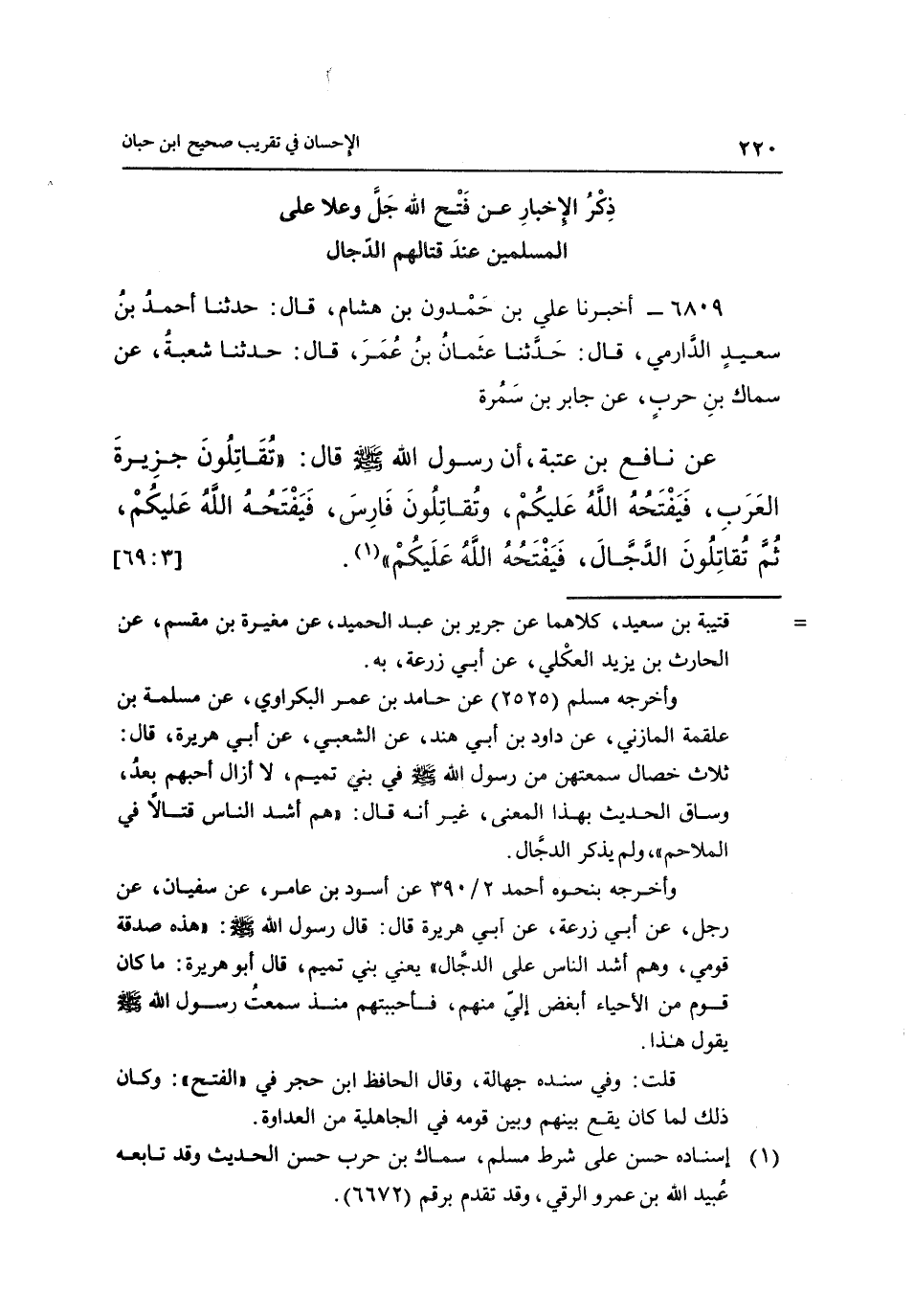 عَنْ نَافِعِ بْنِ عُتْبَةَ، أَنَّ رَسُولَ اللَّهِ صَلَّى اللَّهُ عَلَيْهِ وَسَلَّمَ قَالَ: "تُقَاتِلُونَ جَزِيرَةَ الْعَرَبِ، فَيَفْتَحُهُ اللَّهُ عَلَيْكُمْ، وَتُقَاتِلُونَ فَارِسَ، فَيَفْتَحُهُ اللَّهُ عَلَيْكُمْ، ثم تقاتلون الدجال، فيفتحه الله عليكم" "1". [3: 69]
