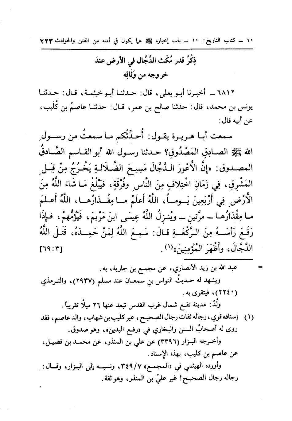 سَمِعْتُ أَبَا هُرَيْرَةَ يَقُولُ: أُحَدِّثُكُمْ مَا سَمِعْتُ مِنْ رَسُولِ اللَّهِ صَلَّى اللَّهُ عَلَيْهِ وَسَلَّمَ الصَّادِقِ الْمَصْدُوقِ؟ حَدَّثَنَا رَسُولُ اللَّهِ أَبُو الْقَاسِمِ الصَّادِقُ الْمَصْدُوقُ: "إِنَّ الْأَعْوَرَ الدَّجَّالَ مَسِيحَ الضَّلَالَةِ يَخْرُجُ مِنْ قِبَلِ الْمَشْرِقِ، فِي زَمَانِ اخْتِلَافٍ مِنَ النَّاسِ وَفُرْقَةٍ، فَيَبْلُغُ مَا شَاءَ اللَّهُ مِنَ الْأَرْضِ فِي أَرْبَعِينَ يَوْمًا، اللَّهُ أَعْلَمُ مَا مِقْدَارُهَا، اللَّهُ أَعْلَمُ مَا مِقْدَارُهَا،- مَرَّتَيْنِ- وينزل الله عيسى بن مَرْيَمَ، فَيَؤُمُّهُمْ، فَإِذَا رَفَعَ رَأْسَهُ مِنَ الرَّكْعَةِ قَالَ: سَمِعَ اللَّهُ لِمَنْ حَمِدَهُ، قَتَلَ اللَّهُ الدجال، وأظهر المؤمنين" "1". [3: 69]